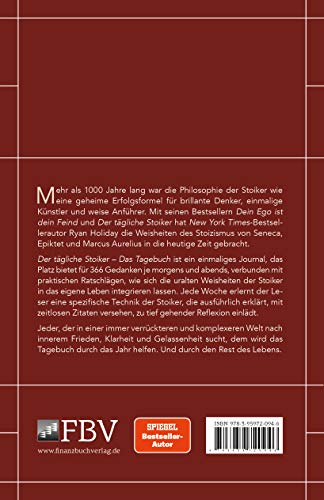 Mehr als 1000 Jahre lang war die Philosophie der Stoiker wie eine geheime Erfolgsformel für brillante Denker, einmalige Künstler und weise Anführer. Mit seinen Bestsellern »Dein Ego ist dein Feind« und »Der tägliche Stoiker« hat New York Times-Bestsellerautor Ryan Holiday die Weisheiten des Stoizismus von Seneca, Epiktet und Marcus Aurelius in die heutige Zeit gebracht. »Der tägliche Stoiker – Das Tagebuch« ist ein einmaliges Journal, das Platz bietet für 366 Gedanken je morgens und abends, verbunden mit praktischen Ratschlägen, wie sich die uralten Weisheiten der Stoiker in das eigene Leben integrieren lassen. Jede Woche erlernt der Leser eine spezifische Technik der Stoiker, die ausführlich erklärt, mit zeitlosen Zitaten versehen, zu tief gehender Reflexion einlädt. Jeder, der in einer immer verrückteren und komplexeren Welt nach innerem Frieden, Klarheit und Gelassenheit sucht, dem wird das Tagebuch durch das Jahr helfen. Und durch den Rest des Lebens.