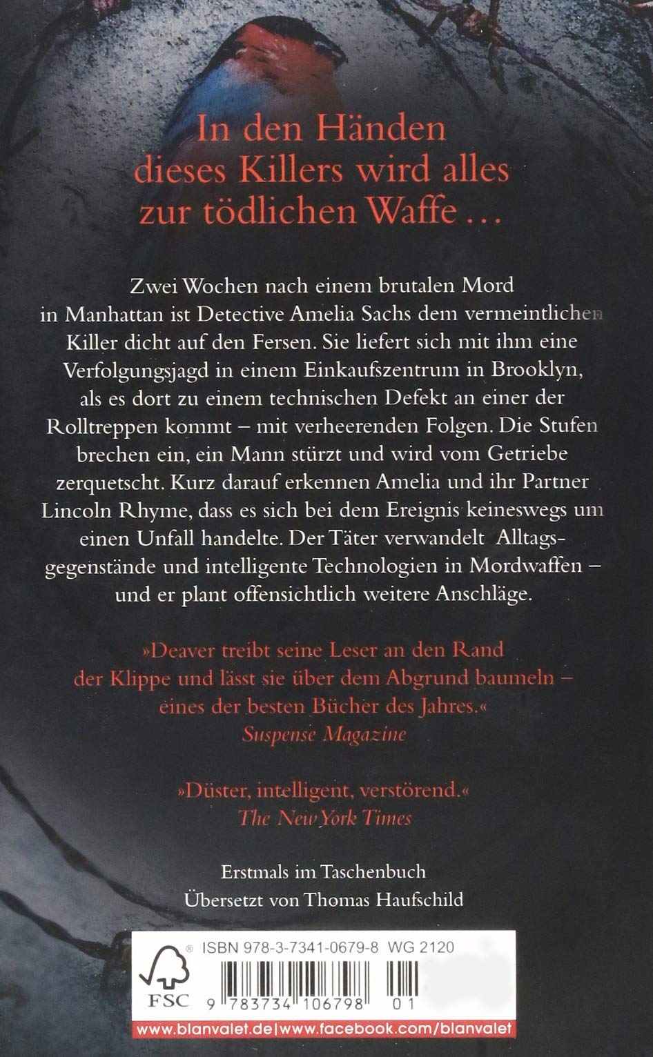 Zwei Wochen nach einem brutalen Mord in Manhattan ist Detective Amelia Sachs dem vermeintlichen Killer dicht auf den Fersen. Sie liefert sich mit ihm eine Verfolgungsjagd in einem Einkaufszentrum in Brooklyn, als es dort zu einem technischen Defekt an einer der Rolltreppen kommt – mit verheerenden Folgen. Die Stufen brechen ein, ein Mann stürzt und wird vom Getriebe zerquetscht. Kurz darauf erkennen Amelia und ihr Partner Lincoln Rhyme, dass es sich bei dem Ereignis keineswegs um einen Unfall handelte. Der Täter verwandelt Alltagsgegenstände und intelligente Technologien in Mordwaffen – und er plant offensichtlich weitere Anschläge.