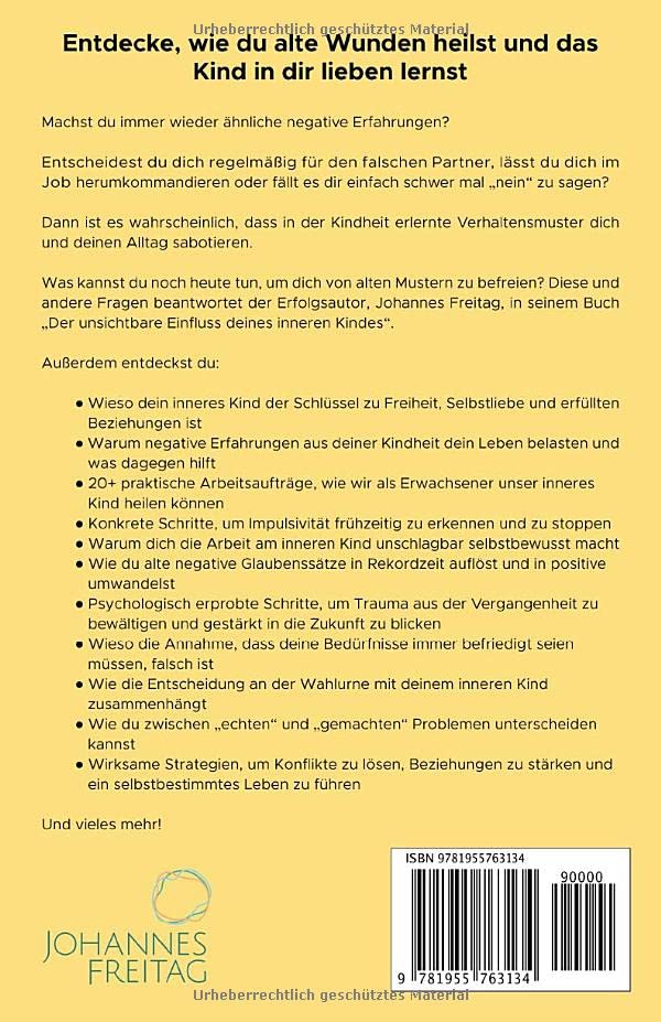 Dann ist es wahrscheinlich, dass in der Kindheit erlernte Verhaltensmuster dich und deinen Alltag sabotieren. Psychologen gehen sogar so weit, zu behaupten, dass 99 % unserer heutigen Probleme aus der Kindheit stammen. Aber was kannst du noch heute tun, um dich von alten Mustern zu befreien? Diese und andere Fragen beantwortet der Erfolgsautor, Johannes Freitag, in seinem Buch „Der unsichtbare Einfluss deines inneren Kindes“. Ausserdem entdeckst du: Wieso dein inneres Kind der Schlüssel zu Freiheit, Selbstliebe und erfüllten Beziehungen ist