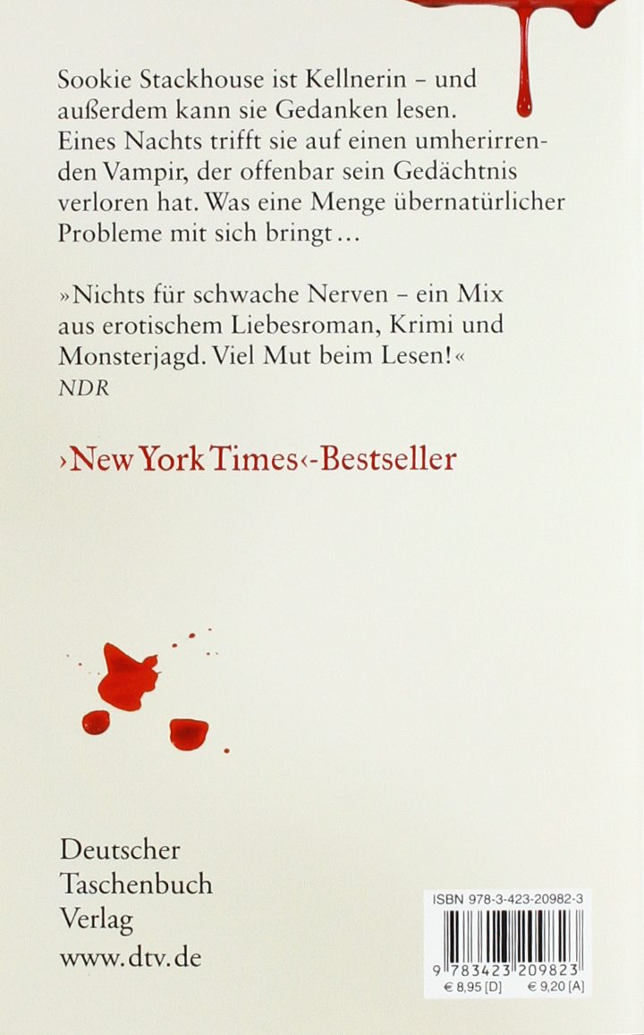 Sookie Stackhouse ist Kellnerin in einer Bar in Louisiana. Sie ist hübsch, jung, ihr Job macht ihr Spaß. Eines Nachts trifft sie auf dem Nachhauseweg auf einen umherirrenden Vampir. Er hat kaum einen Faden am Leib und außerdem sein Gedächtnis verloren. Zum Glück kennt ihn Sookie: Es ist Eric, der Boss ihres Ex-Freunds Bill. An sich ist er ein draufgängerischer, aggressiver Typ, doch mit dem Gedächtnis ist ihm anscheinend ein Teil seiner Persönlichkeit verlorengegangen: auf einmal ist er freundlich, zuvorkommend und schutzbedürftig. Aber er hat ein gewaltiges Problem: Ein Hexenzirkel ist in die kleine Stadt eingefallen und verlangt Schutzgeld von Eric, der ein erfolgreicher Vampir-Bar-Unternehmer ist. Er weigert sich zu zahlen, mit desaströsen Folgen. Sookie nimmt ihn bei sich auf, mit dem Erfolg, daß eine gefährliche Situation die andere jagt. Und da Eric ein sehr attraktiver Vampir ist, kommen die beiden sich bald ziemlich nah.