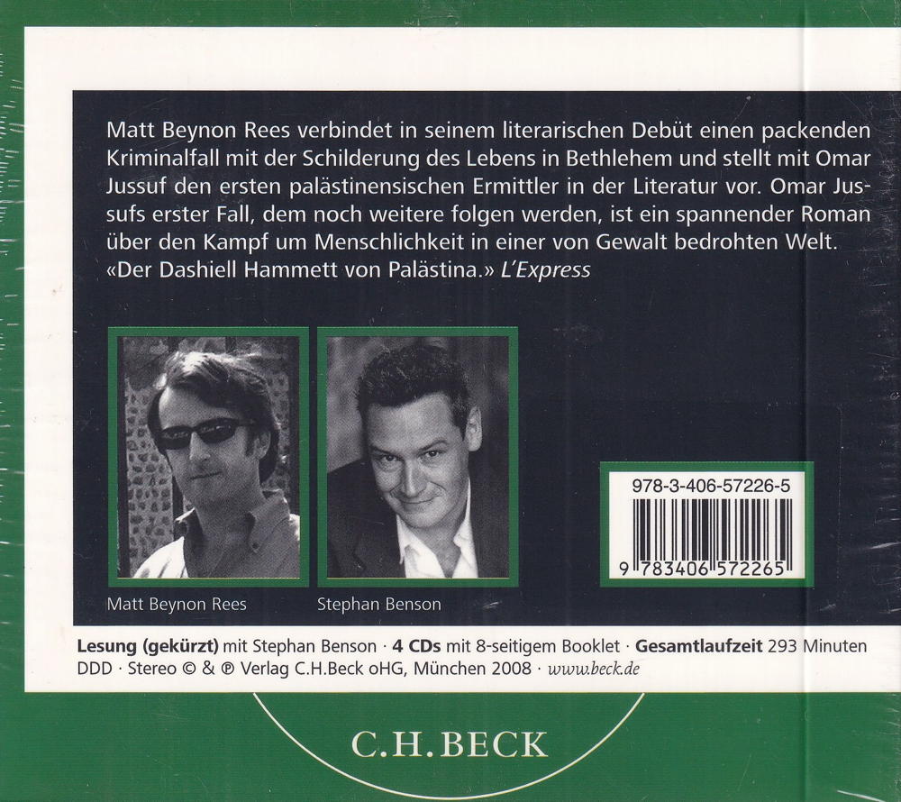 Matt Beynon Rees verbindet in seinem literarischen Debüt einen packenden Kriminalfall mit der Schilderung des Lebens in Bethlehem und stellt mit Omar Jussuf den ersten palästinensischen Ermittler in der Literatur vor. Omar Jussufs erster Fall, dem noch weitere folgen werden, ist ein Roman über den Kampf um Menschlichkeit in einer von Gewalt bedrohten Welt. Der palästinensische Dashiel Hammett Ein Meisterwerk Le Figaro Stephan Benson, geb. 1964, hat an Theatern wie dem Schauspielhaus Zürich, dem Thalia Theater in Hamburg und dem Hamburger Ernst Deutsch Theater gespielt. Er hat sich ausserdem als Fernseh- und Filmdarsteller sowie als Hörspiel- und Hörbuchsprecher einen Namen gemacht.