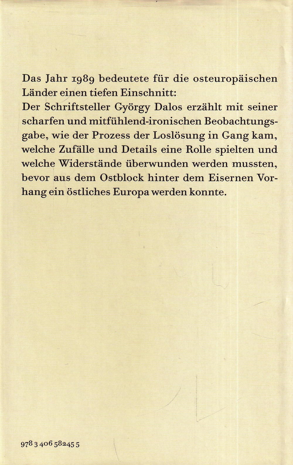 Das Jahr 1989 bedeutete für die osteuropäischen Staaten Polen, Ungarn, DDR, CSSR, Bulgarien und Rumänien nach jahrzehntenlanger Abhängigkeit von der UdSSR und Herrschaft der kommunistischen Diktatur einen tiefen Einschnitt: endlich konnten diese Länder ihr Schicksal selbst in die Hand nehmen, demokratische Strukturen aufbauen und den Anschluss an das westliche Europa suchen. Der Schriftsteller György Dalos erzählt, wie der Prozess der Loslösung in Gang kam, welche Zufälle und Details eine Rolle spielten und welche Widerstände überwunden werden mussten, bevor aus dem Ostblock hinter dem Eisernen Vorhang ein östliches Europa werden konnte. Die Massenflucht der DDR-Bürger über die ungarische Grenze oder der gemeinsame Auftritt von Václav Havel und Aleksander Dubcek auf dem Prager Wenzelsplatz – diese Ereignisse bezeugen eindrucksvoll eine historische Massenaktivität, einen euphorischen und ungebremsten Freiheitsdrang. Diese sich beschleunigende Befreiungsbewegung erhielt in den betreffenden Ländern Namen wie „Systemwechsel“, „Wende“ oder auch „Revolution“ – in jedem Fall leitete sie einen Prozess ein, der zu Demokratie, nationaler Souveränität und einem neuen europäischen Selbstverständnis führte.