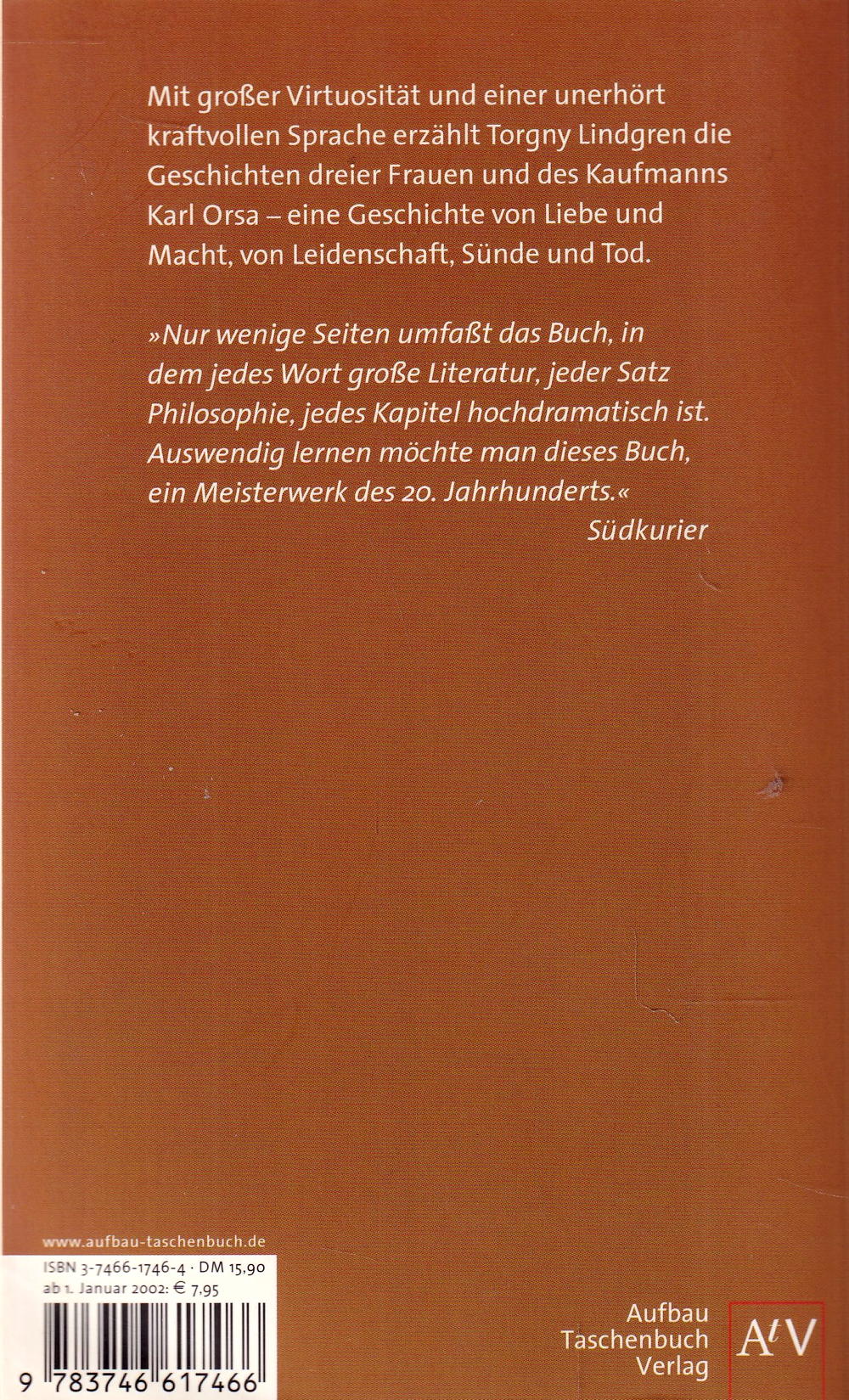 Mit grosser Virtuosität und einer unerhört kraftvollen Sprache erzählt Torgny Lindgren die Geschichten dreier Frauen und des Kaufmanns Karl Orsa - eine Geschichte von Liebe und Macht, von Leidenschaft, Sünde und Tod.