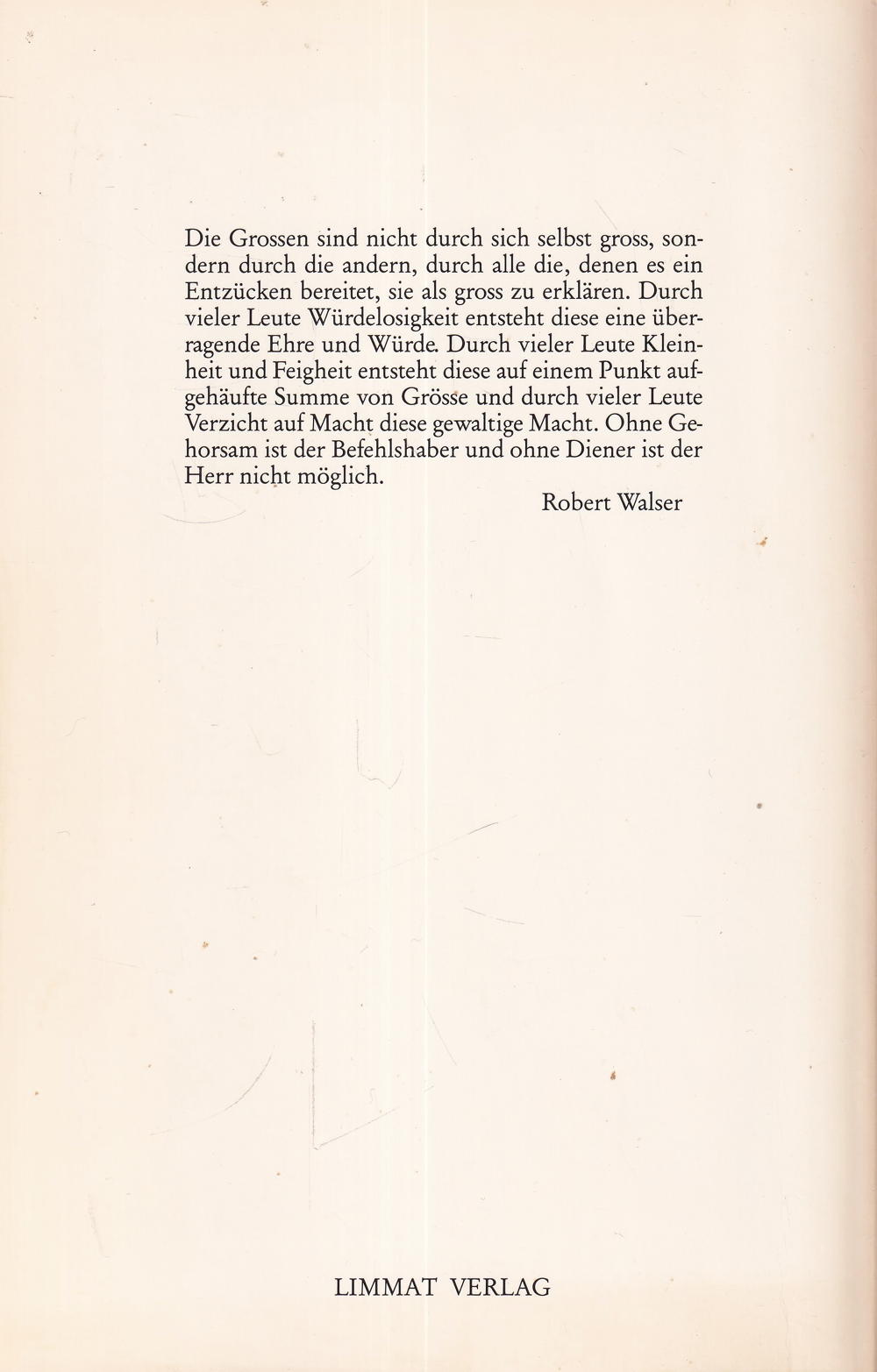Die Grossen sind nicht durch sich selbst gross, sondern durch die andern, durch alle die, denen es ein Entzücken bereitet, sie als gross zu erklären. Durch vieler Leute Würdelosigkeit entsteht diese eine überragende Ehre und Würde. Durch vieler Leute Kleinheit und Feigheit entsteht diese auf einem Punkt aufgehäufte Summe von Grösse und durch vieler Leute Verzicht auf Macht diese gewaltige Macht. Ohne Gehorsam ist der Befehlshaber und ohne Diener ist der Herr nicht möglich.