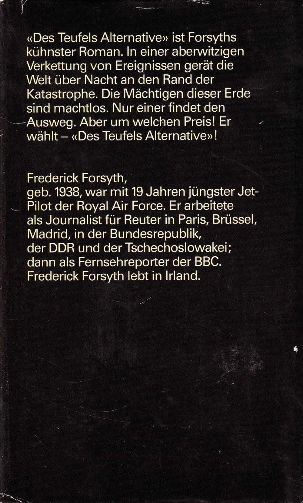 «Des Teufels Alternative» ist Forsyths kühnster Roman. In einer aberwitzigen Verkettung von Ereignissen gerät die Welt über Nacht an den Rand der Katastrophe. Die Mächtigen dieser Erde sind machtlos. Nur einer findet den Ausweg. Aber um welchen Preis! Er wählt- «Des Teufels Alternative»!