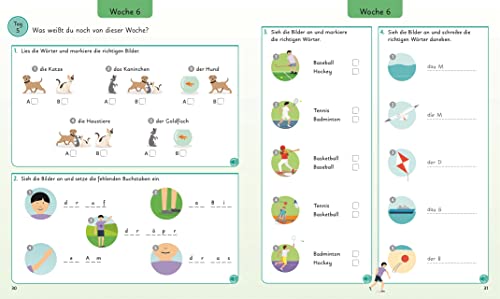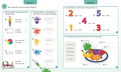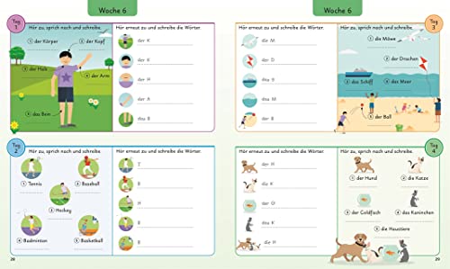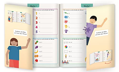 Mit diesem Buch braucht es keine langen Vorbereitungen: Einfach aufschlagen und loslegen! Die Vokabeln sind in Themenbereiche aus dem Alltag von Kindern aufgeteilt, und durch die bunten Illustrationen ganz einfach zu verstehen. Das Wörter lernen mit den verdeckenden Klappen macht Kindern Freude und führt schnell zu ersten Erfolgserlebnissen. Dazu helfen die Audioaufnahmen beim Erlernen und Vertiefen der Aussprache. Ein Konzept zum Deutsch lernen das einfach funktioniert!