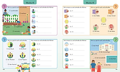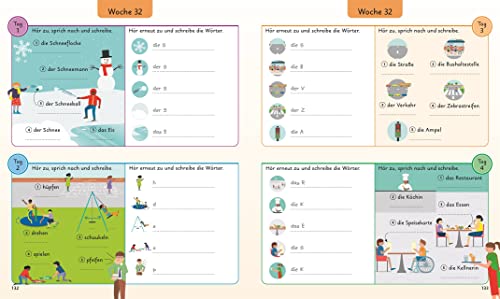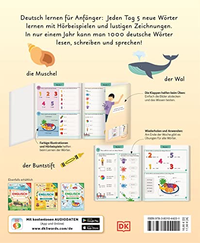 Mit diesem Buch kann jeder kinderleicht 1000 Wörter Deutsch lernen! Dank der speziellen Methode erinnert man sich ganz einfach an 5 Wörter jeden Tag: Vokabeln aus dem Kinderalltag, veranschaulichende, schöne Illustrationen und eingesprochene Hörbeispiele sowie Klappen zum Verdecken der Wörter beim Üben helfen und machen Spass! Am Ende jeder Woche gibt es Wiederholungsübungen zum Vertiefen. So leicht war Deutsch lernen noch nie!