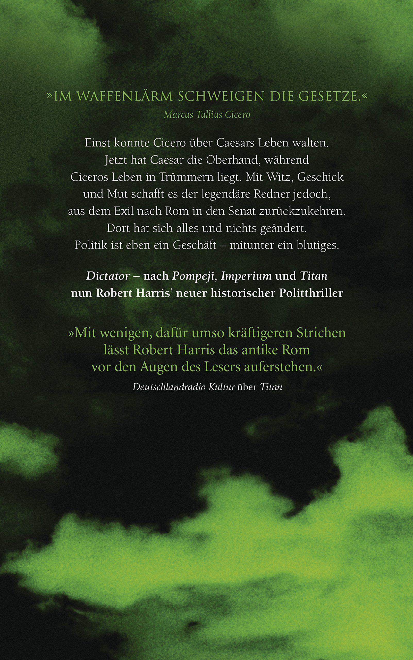 Dictator umfasst bedeutsame Momente der Menschheitsgeschichte: den Untergang der römischen Republik, den folgenden Bürgerkrieg, die Enthauptung von Pompeius und den Meuchelmord an Caesar. Das Thema jedoch ist zeitlos: Wie lässt sich politische Freiheit gegen skrupellosen Ehrgeiz, korrumpierte Wahlen und den verderblichen Einfluss endloser Auslandseinsätze schützen?
