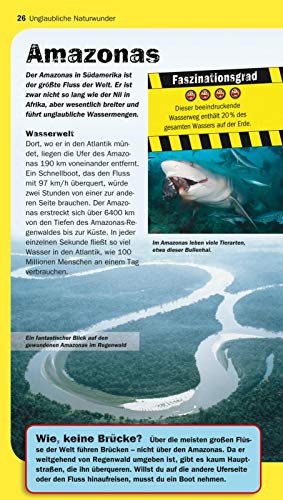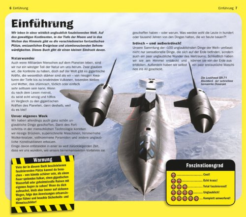 Ob im Wasser, zu Lande, in der Luft oder gar ausserirdisch: Mache dich gefasst auf die 100 unglaublichsten Naturwunder und von Menschenhand geschaffenen Werke. Von den grössten Kreaturen der Meere geht es über explodierende Vulkane und himmelhohe Wasserfälle bis zu den irrsinnigsten Maschinen; inklusive einer Fahrt in der rasantesten Achterbahn der Welt.