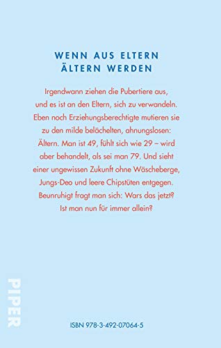 Irgendwann ist es soweit: Wenn aus Pubertieren Erwachsene werden, ist es an Papa und Mama, sich zu verwandeln. Eben noch Gegner mutieren sie zu den milde belächelten, ahnungslosen: Ältern. Und natürlich sind sie darauf ganz schlecht vorbereitet, denn ist ja so: Man ist 49, fühlt sich wie 29 – wird aber behandelt, als sei man 79. Und sieht einer ungewissen Zukunft ohne Wäscheberge, Jungs-Deo und leeren Chipstüten entgegen. Beunruhigt fragt man sich vielleicht: Werden die in die Freiheit entlassenen Pubertiere noch einmal den Weg zurück in den heimischen Stall finden? Und was wird eigentlich, wenn sämtliche Lastschriftaufträge für die Kinder einmal erloschen sein werden? Ist man dann für immer allein?