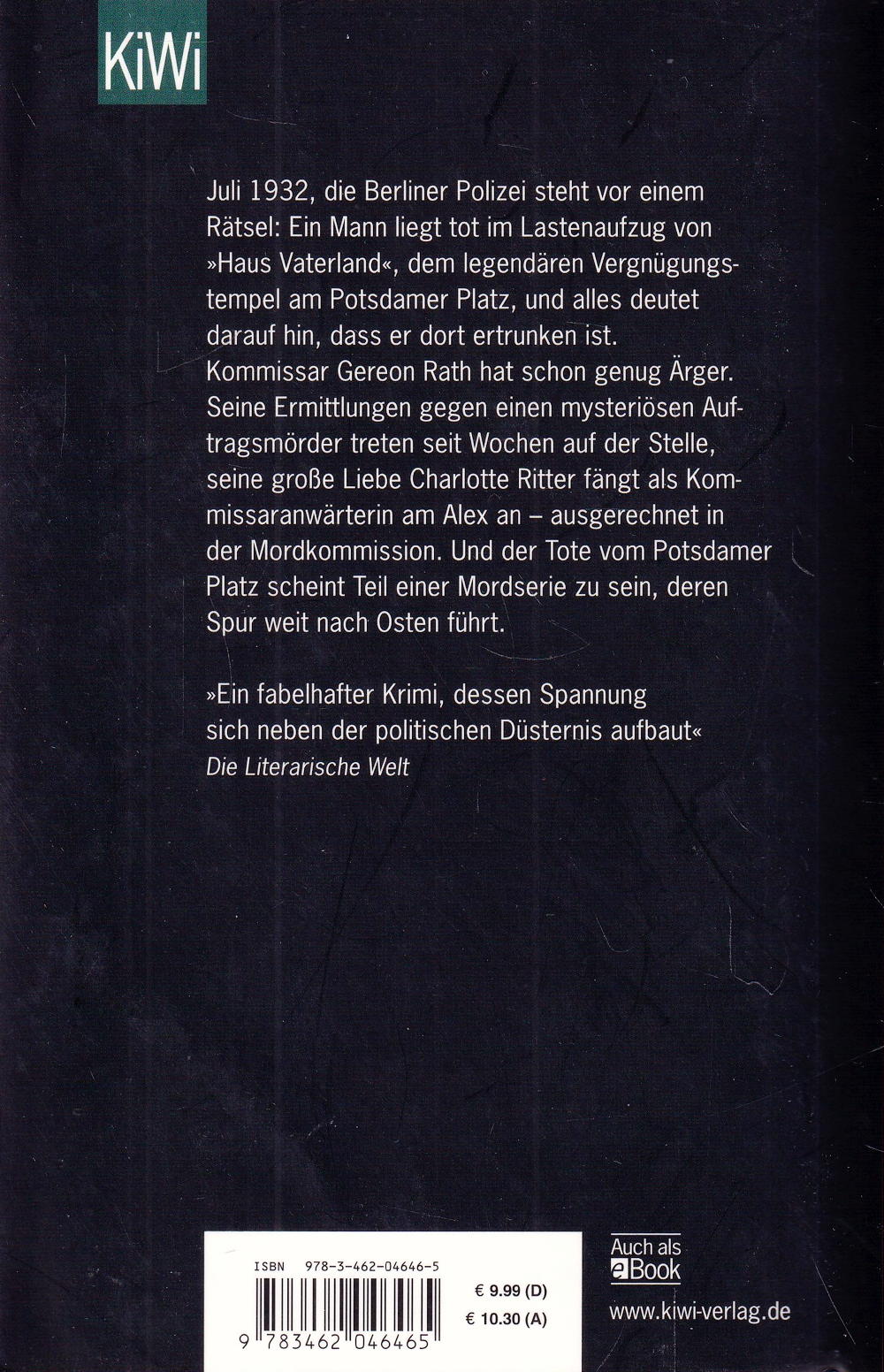 »Ein fabelhafter Krimi, dessen Spannung sich neben der politischen Düsternis aufbaut« Die Literarische Welt Juli 1932, die Berliner Polizei steht vor einem Rätsel: Ein Mann liegt tot im Lastenaufzug von »Haus Vaterland«, dem legendären Vergnügungstempel am Potsdamer Platz, und alles deutet darauf hin, dass er dort ertrunken ist. Kommissar Gereon Rath hat schon genug Ärger. Seine Ermittlungen gegen einen mysteriösen Auftragsmörder treten seit Wochen auf der Stelle, seine grosse Liebe Charlotte Ritter fängt als Kommissaranwärterin am Alex an – ausgerechnet in der Mordkommission. Und der Tote vom Potsdamer Platz scheint Teil einer Mordserie zu sein, deren Spur weit nach Osten führt.