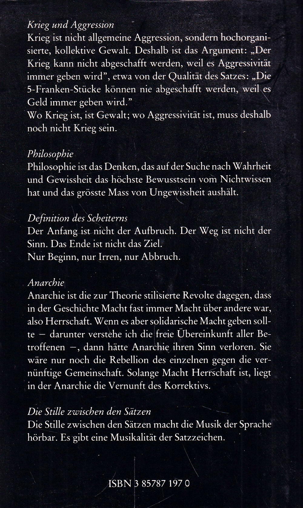 Das Buch bricht aus der herkömmlichen philosophischen Schriftstellerei radikal aus. Es bindet sich weder an eine Einheit des Themas noch der Methode, noch des Stils. Es vertritt keine Lehre und propagiert keinen Sinn. Die Kurztexte aus zwei Jahrzehnten stehen - auch nicht chronologisch geordnet - zufällig nebeneinander und sind in keiner Weise aufeinander abgestimmt. Es ist deshalb unwichtig, in welcher Reihenfolge sie gelesen werden. Schreiben wird verstanden als ein Experiment, auf das der Leser in seiner Weise eingeht, und Philosophie als experimentelles Denken, dessen stärkste Qualitäten die Freiheit von allen Strickmustern und die Widerrufbarkeit sind.