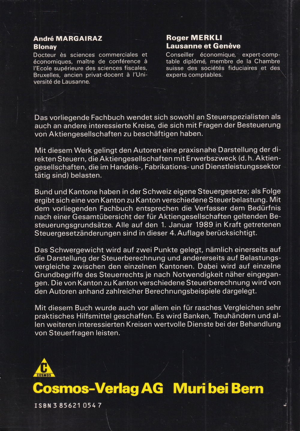 Bund und Kantone haben in der Schweiz eigene Steuergesetze; als Folge ergibt sich eine von Kanton zu Kanton verschiedene Steuerbelastung. Mit dem vorliegenden Fachbuch entsprechen die Verfasser dem Bedürfnis nach einer Gesamtübersicht der für Aktiengesellschaften geltenden Besteuerungsgrundsätze. Alle auf den 1. Januar 1989 in Kraft getretenen Steuergesetzänderungen sind in dieser 4. Auflage berücksichtigt.