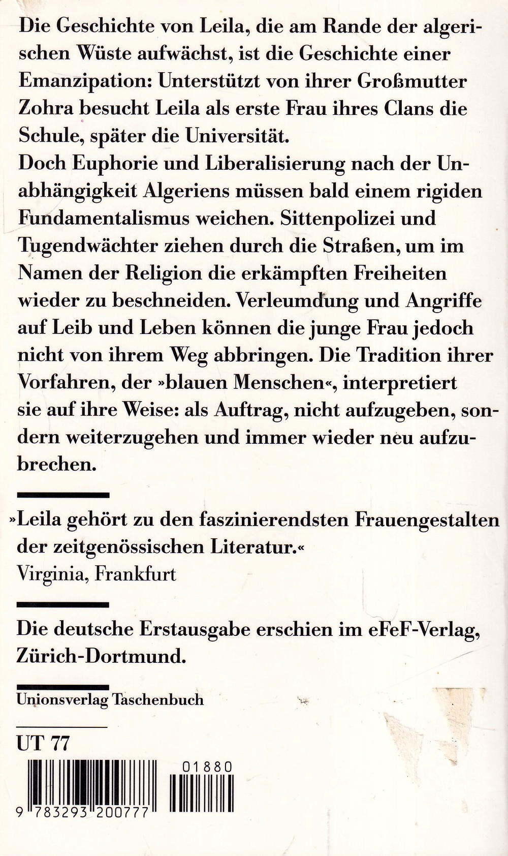 Die Geschichte von Leila, die am Rande der algerischen Wüste aufwächst, ist die Geschichte einer Emanzipation: Unterstützt von ihrer Grossmutter Zohra, einer sesshaft gewordenen Nomadin, widersetzt sich Leila erfolgreich der Verheiratung und besucht als erste Frau ihres Clans die Schule, später die Universität. Doch die Liberalisierung nach der Unabhängigkeit Algeriens muss bald einem rigiden Fundamentalismus weichen, der die Frauen wieder unter den Schleier und ins Haus zurückdrängen will. Verleumdung, Verachtung und Angriffe auf Leib und Leben können die junge Frau jedoch nicht von ihrem Weg abbringen. Die Tradition ihrer Vorfahren, der »blauen Menschen«, interpretiert sie auf ihre Weise: als Auftrag, nicht aufzugeben, sondern weiterzugehen und immer wieder neu aufzubrechen.
