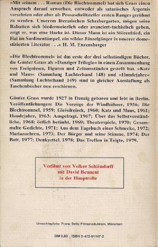H. M. Enzensberger »Die Blechtrommel« ist das erste der drei selbständigen Bücher, die Günter Grass als »Danziger Trilogie« in einen Zusammenhang von Ereignissen, Figuren und Zeitumständen gestellt hat. »Katz und Maus« (Sammlung Luchterhand 148) und »Hundejahre« (Sammlung Luchterhand 149) sind in gleicher Ausstattung als Taschenbücher lieferbar.