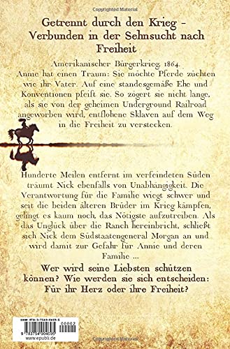 Getrennt durch den Krieg – Verbunden in der Sehnsucht nach Freiheit. Amerikanischer Bürgerkrieg, 1864. Annie hat einen Traum: Sie möchte Pferde züchten wie ihr Vater. Auf eine standesgemässe Ehe und Konventionen pfeift sie. So zögert sie nicht lange, als sie von der geheimen Underground Railroad angeworben wird, entflohene Sklaven auf dem Weg in die Freiheit zu verstecken. Hunderte Meilen entfernt im verfeindeten Süden träumt Nick ebenfalls von Unabhängigkeit. Die Verantwortung für die Familie wiegt schwer und seit die beiden älteren Brüder im Krieg kämpfen, gelingt es kaum noch, das Nötigste aufzutreiben. Als das Unglück über die Ranch hereinbricht, schliesst sich Nick dem Südstaatengeneral Morgan an und wird damit zur Gefahr für Annie und deren Familie … Wer wird seine Liebsten schützen können? Wie werden sie sich entscheiden: Für ihr Herz oder ihre Freiheit?