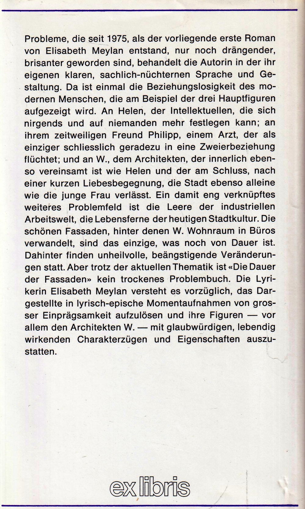 Dahinter finden unheilvolle, beängstigende Veränderungen statt. Aber trotz der aktuellen Thematik ist «Die Dauer der Fassaden» kein trockenes Problembuch. Die Lyrikerin Elisabeth Meylan versteht es vorzüglich, das Dargestellte in lyrisch-epische Momentaufnahmen von grosser Einprägsamkeit aufzulösen und ihre Figuren allem den Architekten W. - mit glaubwürdigen, lebendig wirkenden Charakterzügen und Eigenschaften auszuvor statten.