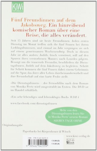 Fünf Freundinnen auf dem Jakobsweg. Ein hinreissend komischer Roman über eine Reise, die alles verändert. Fünf Freundinnen. Seit über 15 Jahren treffen sie sich regelmässig am ersten Dienstag im Monat. In ihrem Stammlokal nennt man sie die Dienstagsfrauen. Einmal im Jahr unternehmen die fünf Frauen etwas gemeinsam. Dieses Jahr haben sie etwas ganz Besonderes vor: Pilgern auf dem Jakobsweg. Am Ende dieser Reise ist nichts mehr, wie es war. Würden sie sich heute begegnen, wären sie wohl gar nicht miteinander befreundet. Aber seit die fünf Frauen vor 15 Jahren nach ihrem Französischkurs auf einen Absacker bei Luc eingefallen sind, ist am ersten Dienstag im Monat der Kamintisch für sie reserviert. Fünf Frauen, nun dies- und jenseits der vierzig, mit sehr unterschiedlichen Temperamenten: Da ist Caroline, die Strafverteidigerin, verheiratet und Mutter zweier erwachsener Kinder. Organisiert, konsequent und streitbar. Sie sagt, was sie denkt, und sie tut, was sie sagt. Und kann trotzdem gut mit Kikis Chaos umgehen. Kiki, chronisch gut gelaunt, gern verliebt, entwirft beruflich Haushaltsgegenstände. Sie hofft auch mit 35 noch, von der Wegwerfware wegzukommen. Bei Aufträgen und bei Männern. Eva wäre schon froh, wenn sie ein eigenes Leben hätte. Als Hausfrau, Ehefrau und Mutter mit brachliegender medizinischer Approbation ist sie geplagt von den schrecklichen »V’s«: vierzig, vier Kinder, verirrt. Estelle, die Apothekergattin, ist die Frau, die immer zu viel in den Koffer packt und das Tragen anderen überlässt. Einig sind sie sich nur, wenn es darum geht, ihrer Freundin Judith beizustehen. Die zierliche Kindfrau ist die Dramaqueen der Dienstagsfrauen. Sie bespricht ihre Probleme lieber, als dass sie sie löst. Doch wer will ihr das übel nehmen? Jetzt, wo sie gerade Witwe geworden ist?