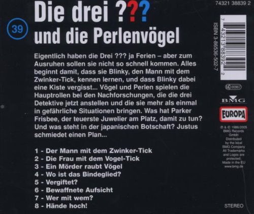Eigentlich haben die Drei??? ja Ferien - aber zum Ausruhen sollen sie nicht so schnell kommen. Alles beginnt damit, dass sie Blinky, den Mann mit dem Zwinker-Tick, kennen lernen, und dass Blinky dabei eine Kiste vergisst... Vögel und Perlen spielen die Hauptrollen bei den Nachforschungen, die die drei Detektive jetzt anstellen und die sie mehr als einmal in gefährliche Situationen bringen. Was hat Parker Frisbee, der teuerste Juwelier am Platz, damit zu tun? Und was steht in der japanischen Botschaft? Justus schmiedet einen Plan...