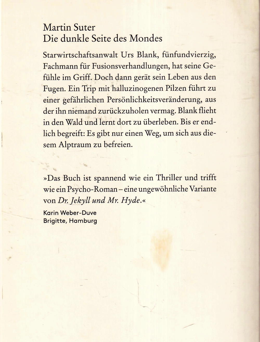 Starwirtschaftsanwalt Urs Blank, fünfundvierzig, Fachmann für Fusionsverhandlungen, hat seine Gefühle im Griff. Doch dann gerät sein Leben aus den Fugen. Ein Trip mit halluzinogenen Pilzen führt zu einer gefährlichen Persönlichkeitsveränderung, aus der ihn niemand zurückzuholen vermag. Blank flieht in den Wald und lernt dort zu überleben. Bis er endlich begreift: Es gibt nur einen Weg, um sich aus diesem Alptraum zu befreien.
