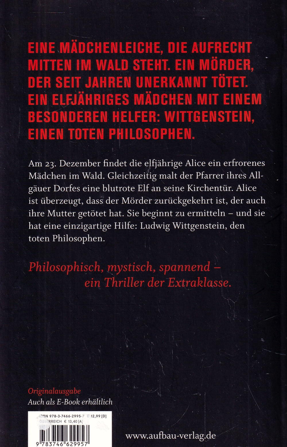Eine Mädchenleiche, die aufrecht mitten im Wald steht. Ein Mörder, der seit Jahren unerkannt tötet. Ein elfjähriges Mädchen mit einem besonderen Helfer: Wittgenstein, einen toten Philosophen. Alice ist elf Jahre alt, sehr intelligent und das, was man in ihrer Allgäuer Heimat als besserwisserisch bezeichnet. Und sie hat eine besondere Gabe: Sie spricht mit dem Philosophen Wittgenstein, der 1951 gestorben ist. Er taucht auf, wo sie es am wenigsten erwartet, und verschwindet auch ebenso geheimnisvoll. Als Alice in ihrem Dorf die erfrorene Leiche eines Mädchens findet, ist sie überzeugt, dem Mörder auf der Spur zu sein, der vor Jahren auch ihre Mutter getötet hat. Gemeinsam mit Ludwig Wittgenstein beginnt sie zu ermitteln. Doch niemand schenkt den Vermutungen einer Elfjährigen Gehör, bis auf einen und der will sie zum Schweigen bringen. Philosophisch, mystisch, spannend – ein Thriller der Extraklasse.