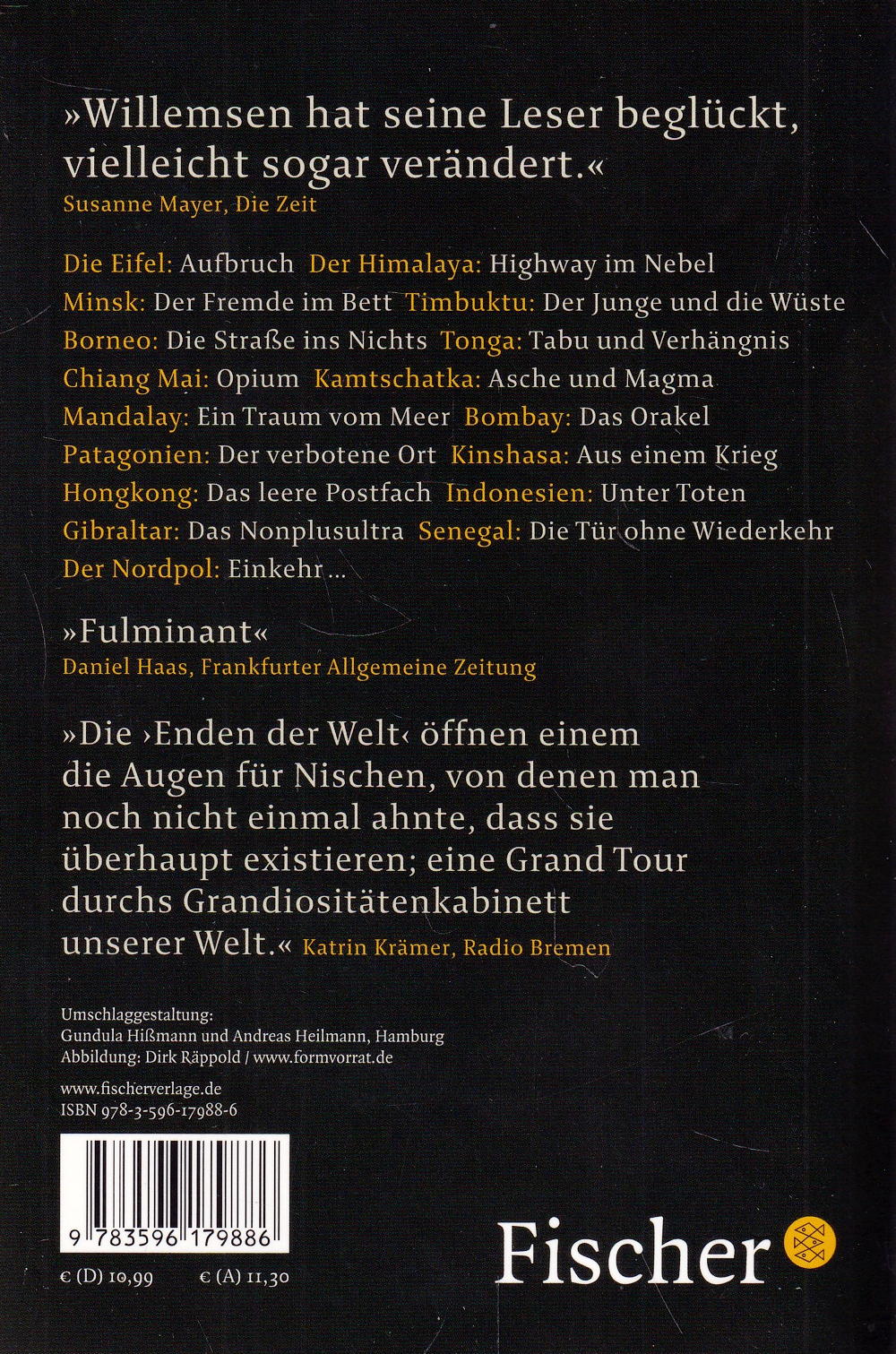 Auf fünf Erdteilen war Roger Willemsen unterwegs, um seine ganz persönlichen Enden der Welt zu finden. Manchmal waren es die grossen geographischen: das Kap in Südafrika, Patagonien, der Himalaja, die Südsee, der Nordpol. Manchmal waren es aber auch ganz einzigartige, individuelle Endpunkte: ein Bordellflur in Bombay, ein Bett in Minsk, ein Fresko des Jüngsten Gerichts in Orvieto, eine Behörde im Kongo. Immer aber geht es in diesen grandiosen literarischen Reisebildern auch um ein Enden in anderem Sinn: um ein Ende der Liebe und des Begehrens, der Illusionen, der Ordnung und Verständigung. Um das Ende des Lebens - und um den Neubeginn.