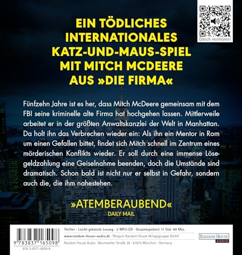 Mitch McDeere arbeitet in der grössten Anwaltskanzlei der Welt in Manhattan. Fünfzehn Jahre ist es her, dass er gemeinsam mit dem FBI seine verbrecherische alte Firma hochgehen liess. Doch nun holt ihn seine Vergangenheit ein: Als ihn ein Mentor in Rom um einen Gefallen bittet, findet sich Mitch schnell im Zentrum einer internationalen Verschwörung wieder. Er soll eine Geiselnahme beenden, doch die Umstände sind hochdramatisch. Schnell ist nicht nur er selbst in höchster Gefahr, sondern auch die, die ihm nahestehen. leicht gekürzte Lesung mit Charles Brauer 2 MP3-CDs, 11h 40min