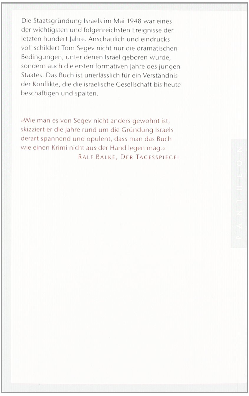 Pioniere und Überlebende: Ein Porträt des jungen jüdischen Staates Die Staatsgründung Israels im Mai 1948 war eines der wichtigsten und folgenreichsten Ereignisse der letzten hundert Jahre. Wie kein Zweiter versteht es Tom Segev, ein Zeitgemälde der ersten Generation der Israelis mit all ihren Widersprüchen zu entwerfen. Indem er gleichermassen die grossen politischen Zusammenhänge und die individuellen Perspektiven zusammen führt, beschreibt Segev das Bild einer jungen Gesellschaft, die einerseits seine Notgemeinschaft und zugleich tief gespalten war: Immigrierte Holocaust- überlebende trafen auf Siedler der ersten Stunde, Juden trafen auf Palästinenser.