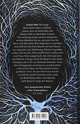 Rau, düster und bitterkalt Island 1686: Die junge Rósa leidet unter so bitterer Armut, dass sie befürchtet, den Winter nicht zu überleben. In ihrer Verzweiflung nimmt sie den Antrag des reichen Händlers Jón an, der eine Frau für Haus und Hof sucht. Rósa folgt ihm in sein Dorf und trifft bei den Einwohnern auf eine Mauer aus Argwohn und Ablehnung. Düstere Legenden ranken sich um Jón. Man erzählt sich, er habe seine erste Frau Anna umgebracht. Jón schweigt dazu unerbittlich. Einziger Trost für Rósa ist eine kleine Glasfigur, die er ihr zur Hochzeit schenkte. Trotz aller Widrigkeiten erscheint sie unzerbrechlich, während das Böse um Rósa herum immer greifbarer wird. Als das Dorf eines Nachts von Schnee und Eis bedeckt wird, rückt die Bedrohung näher, und diesmal steht Rósa im Auge des Sturms. »Ein fantastisches Debüt voller Atmosphäre.
