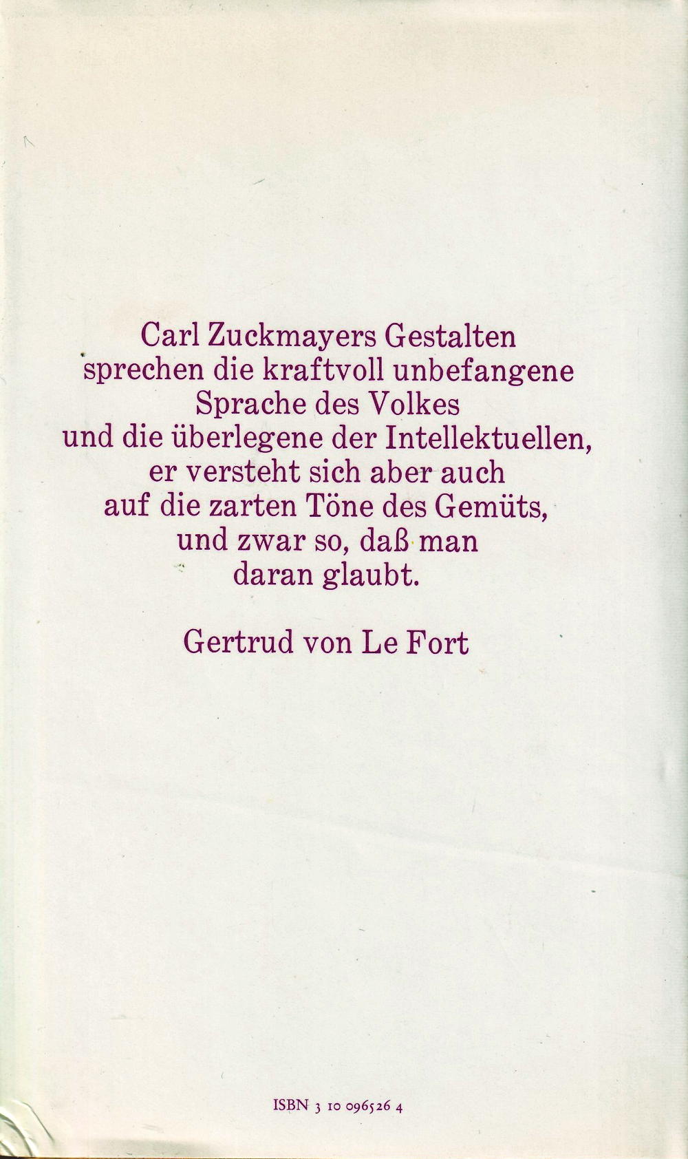 Carl Zuckmayer, geb. 1896 in Nackenheim am Rhein, meldete sich nach dem Abitur in Mainz als Kriegsfreiwilliger. 1918 begann er ein kurzes Studium der Geistes- und Naturwissenschaften in Frankfurt a.M. und Heidelberg. 1920 ging er nach Berlin. Erste Stücke blieben ohne Erfolg, erst 'Der fröhliche Weinberg' brachte ihm 1925 den Durchbruch und den Kleist-Preis. 1933 verhängten die Nationalsozialisten ein Aufführungsverbot über ihn. Er zog in sein Haus nach Salzburg. 1938 floh er in die Schweiz, ein Jahr später emigrierte er in die USA, wo er als Farmer lebte. Von 1947 bis 1957 hielt er sich abwechselnd in der Schweiz und in den USA auf. 1958 kehrte er endgültig in die Schweiz zurück. Am 18. Januar 1977 ist er als einer der über Jahrzehnte erfolgreichsten deutschsprachigen Autoren in Visp (Wallis) gestorben.