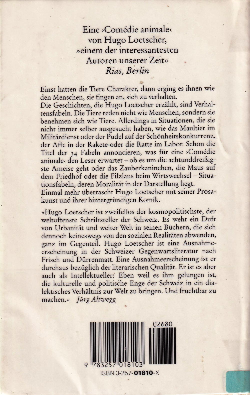 Einst hatten die Tiere Charakter, dann erging es ihnen wie den Menschen, sie fingen an, sich zu verhalten. Die Geschichten, die Hugo Loetscher erzählt, sind Verhaltensfabeln. Die Tiere reden nicht wie Menschen, sondern sie benehmen sich wie Tiere. Allerdings in Situationen, die sie nicht immer selber ausgesucht haben, wie das Maultier im Militärdienst oder der Pudel auf der Schönheitskonkurrenz, der Affe in der Rakete oder die Ratte im Labor. Schon die Titel der 34 Fabeln annoncieren, was für eine "Comédie animale" den Leser erwartet - ob es um die achtunddreissigste Ameise geht oder das Zauberkaninchen, die Maus auf dem Friedhof oder die Filzlaus beim Wirtswechsel - Situationsfabeln, deren Moralität in der Darstellung liegt. Einmal mehr überrascht Hugo Loetscher mit seiner Prosakunst und ihrer hintergründigen Komik.