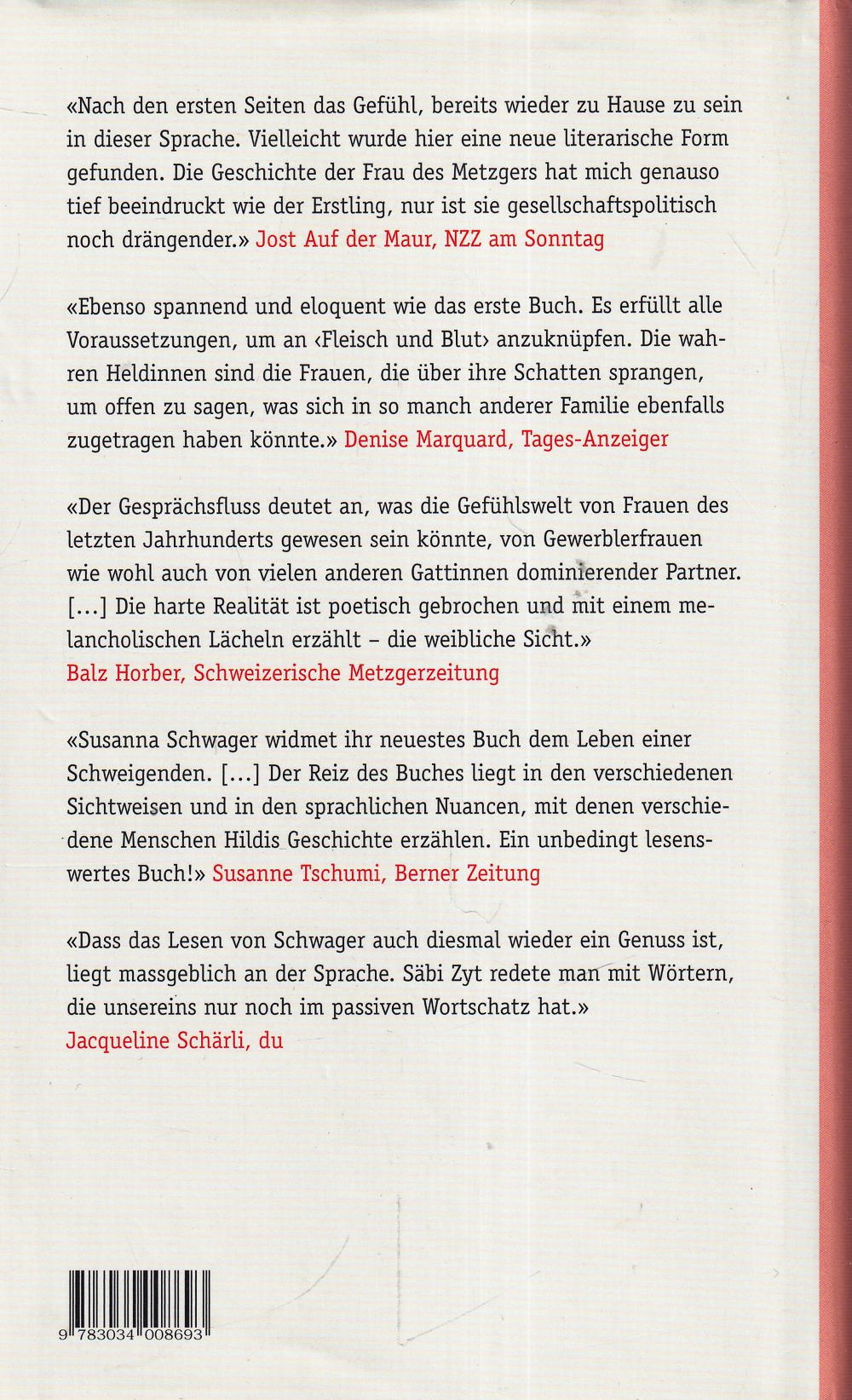 Susanna Schwager führt uns zurück in die Kindheit und Jugend einer Generation, die daran ist, uns zu verlassen. Dort, in einer armen Grossfamilie aus dem Solothurnischen, beginnt die Geschichte von Hildi Meister, der Frau des Metzgers. Zu ihr, der Schweigsamen, die vor fünfzehn Jahren starb, führt uns ein Geflecht von Stimmen, die sich erinnern, wie sie als Kind mitten in einer Schar von Geschwistern aufwuchs, wie sie als Jugendliche in der Fabrik arbeitete, um den dringend benötigten Lohn nach Hause zu bringen. Von der Unwissenheit beim Erwachsenwerden ist die Rede, vom Tändeln und von der ersten Liebe, vom Kinderkriegen und vom Heiratenmüssen. Und dann kam das Leben an der Seite von Hans Meister, dem jungen Metzgerburschen, der ganz unten anfing und sie, als es bergauf ging, vom Dorf in die Stadt verpflanzte. Eine Familie wurde gegründet, ein eigenes Geschäft. Wer war diese Frau und wer wurde sie?