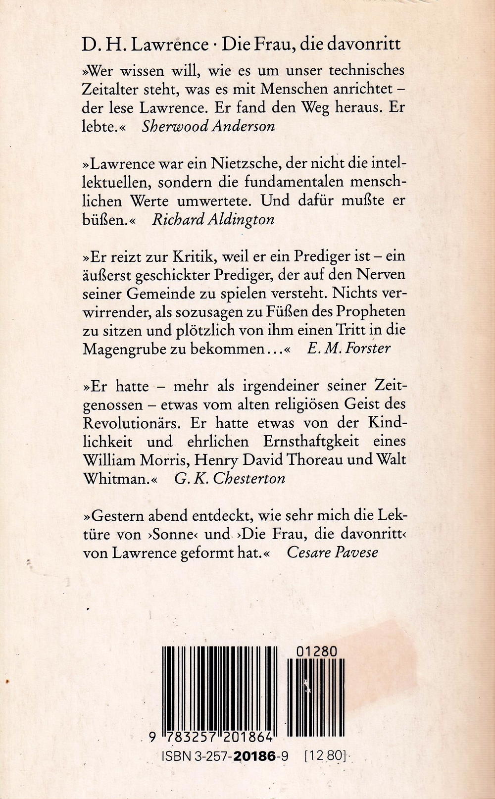 Er reizt zur Kritik, weil er ein Prediger ist - ein äusserst geschickter Prediger, der auf den Nerven seiner Gemeinde zu spielen versteht. Nichts verwirrender, als sozusagen zu Füssen des Propheten zu sitzen und plötzlich von ihm einen Tritt in die Magengrube zu bekommen. E. M. Forster