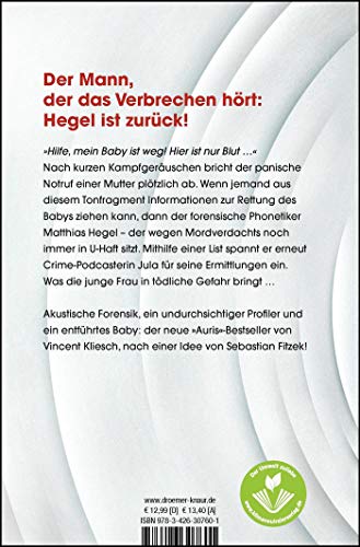 Akustische Forensik, ein undurchsichtiger Profiler und ein entführtes Baby: die rasante Fortsetzung des Nr. -1-Spiegel-Bestsellers »Auris« der Thriller-Autoren Vincent Kliesch und Sebastian Fitzek!»Hilfe, mein Baby ist weg! Hier ist nur Blut …« Nach kurzen Kampfgeräuschen bricht der panische Notruf einer Mutter bei der Nummer 112 plötzlich ab. Wenn jemand aus diesem Tonfragment Rückschlüsse auf den Aufenthaltsort der Frau ziehen kann, dann der forensische Phonetiker Matthias Hegel – den einige nach wie vor für einen Mörder halten. True-Crime-Podcasterin Jula Ansorge ist es zwar gelungen, Hegel vom Mordverdacht an seiner Frau zu entlasten, doch dabei ist sie der dunklen Seite des genialen Profilers deutlich zu nahe gekommen. Als Hegel nun im Fall des entführten Babys erneut auf ihre Recherche-Fähigkeiten zurückgreifen will, weigert Jula sich zunächst. Doch kann sie das Baby und seine Mutter wirklich ihrem Schicksal überlassen? Und was ist mit den Informationen zu ihrem tot geglaubten Bruder Moritz, die Hegel ihr angeblich beschaffen will?Auch im zweiten Teil der Thriller-Reihe ziehen die Bestseller-Autoren Vincent Kliesch und Sebastian Fitzek wieder alle Register: Nichts ist, wie es auf den ersten Blick scheint, und niemand bleibt so unschuldig, wie er es gern wäre. Rasante Spannung für die Fans aussergewöhnlicher Thriller mit mehr als einer unerwarteten Wendung!