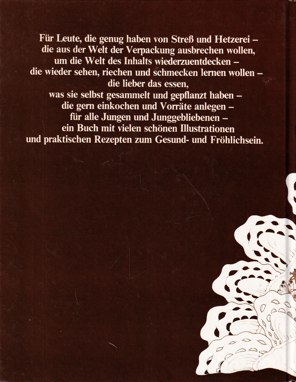 Für Leute, die genug haben von Stress und Hetzerei – die aus der Welt der Verpackung ausbrechen wollen, um die Welt des Inhalts wiederzuentdecken - die wieder sehen, riechen und schmecken lernen wollen die lieber das essen, was sie selbst gesammelt und gepflanzt haben die gern einkochen und Vorräte anlegen – für alle Jungen und Junggebliebenen ein Buch mit vielen schönen Illustrationen.
