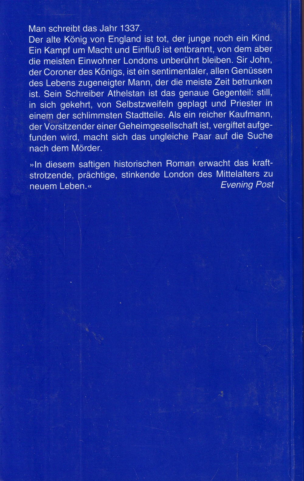 Ein Kampf um Macht und Einfluss ist entbrannt, von dem aber die meisten Einwohner Londons unberührt bleiben. Sir John, der Coroner des Königs, ist ein sentimentaler, allen Genüssen des Lebens zugeneigter Mann, der die meiste Zeit betrunken ist. Sein Schreiber Athelstan ist das genaue Gegenteil: still, in sich gekehrt, von Selbstzweifeln geplagt und Priester in einem der schlimmsten Stadtteile. Als ein reicher Kaufmann, der Vorsitzender einer Geheimgesellschaft ist, vergiftet aufgefunden wird, macht sich das ungleiche Paar auf die Suche nach dem Mörder.
