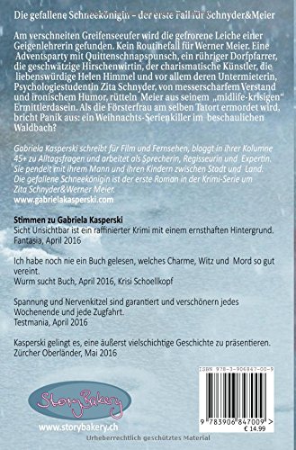 Die gefallene Schneekönigin – der erste Fall für Schnyder&Meier Am verschneiten Greifenseeufer wird die gefrorene Leiche einer Geigenlehrerin gefunden. Kein Routinefall für Werner Meier. Eine Adventsparty mit Quittenschnapspunsch, ein rühriger Dorfpfarrer, die geschwätzige Hirschenwirtin, der charismatische Künstler, die liebenswürdige Helen Himmel und vor allem deren Untermieterin, Psychologiestudentin Zita Schnyder, von messerscharfem Verstand und ironischem Humor, rütteln Commissario Meier aus seinem „midlife-krisigen“ Ermittlerdasein. Als die Försterfrau am selben Tatort ermordet aufgefunden wird, bricht Panik aus: ein Weihnachts-Serienkiller im beschaulichen Waldbach? Mit Schnyder&Meier zeigt Gabriela Kasperski das Beziehungs-, Berufs- und Familienleben eines heutigen Paares, eingebettet in aktuelle Kriminalfälle.