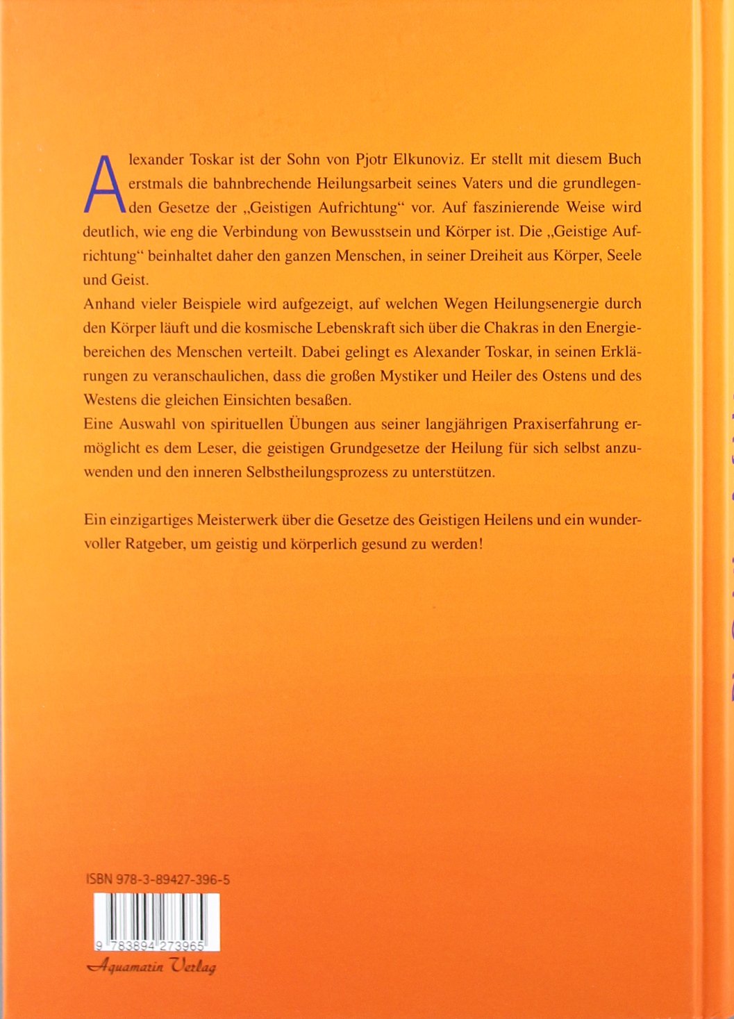 Alexander Toskar ist der Sohn von Pjotr Elkunoviz. Er stellt mit diesem Buch erstmals die bahnbrechende Heilungsarbeit seines Vaters und die grundlegenden Gesetze der "Geistigen Aufrichtung" vor. Auf faszinierende Weise wird deutlich, wie eng die Verbindung von Bewusstsein und Körper ist. Die "Geistige Aufrichtung" beinhaltet daher den ganzen Menschen, in seiner Dreiheit aus Körper, Seele und Geist.