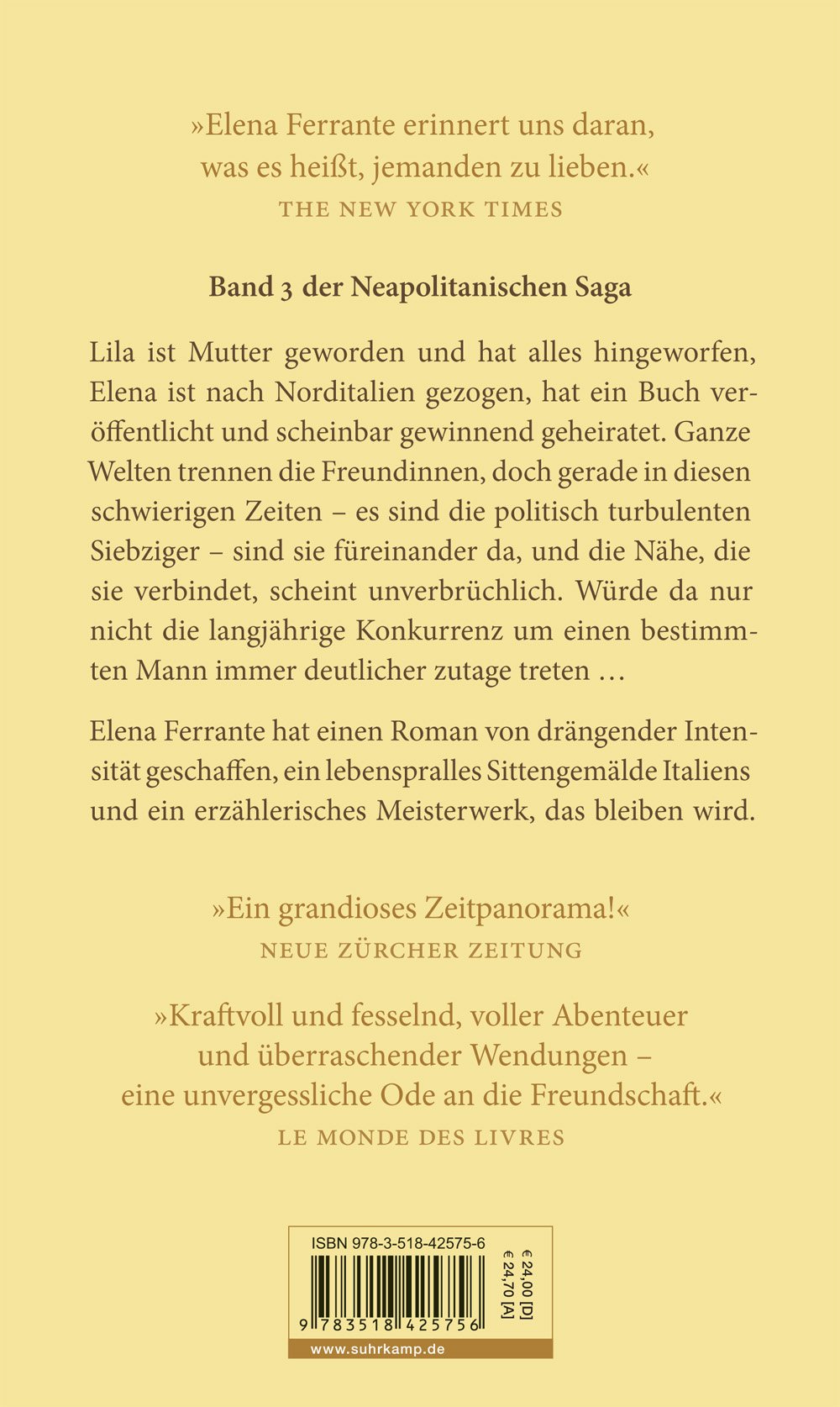 Es sind die turbulenten siebziger Jahre und die beiden inzwischen erwachsene Frauen. Lila ist Mutter geworden und hat sich befreit und alles hingeworfen - den Wohlstand, ihre Ehe, ihren neuen Namen - und arbeitet unter entwürdigenden Bedingungen in einer Fabrik. Elena hat ihr altes neapolitanisches Viertel hinter sich gelassen, das Studium beendet und ihren ersten Roman veröffentlicht. Als sie in eine angesehene norditalienische Familie einheiratet und ihrerseits ein Kind bekommt, hält sie ihren gesellschaftlichen Aufstieg für vollendet. Doch schon bald muss sie feststellen, dass sie ständig an Grenzen gerät. Ganze Welten trennen die Freundinnen, doch gerade in diesen schwierigen Jahren sind sie füreinander da, die Nähe, die sie verbindet, scheint unverbrüchlich. Würde da nur nicht die langjährige Konkurrenz um einen bestimmten Mann immer deutlicher zutage treten.