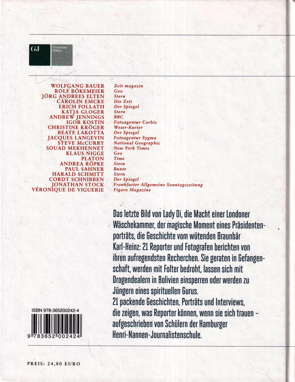 Das letzte Bild von Lady Di, die Macht einer Londoner Wäschekammer, der magische Moment eines Präsidentenporträts, die Geschichte vom wütenden Braunbär Karl-Heinz: 21 Reporter und Fotografen berichten von ihren aufregendsten Recherchen. Sie geraten in Gefangenschaft, werden mit Folter bedroht, lassen sich mit Drogendealern in Bolivien einsperren oder werden zu Jüngern eines spirituellen Gurus.