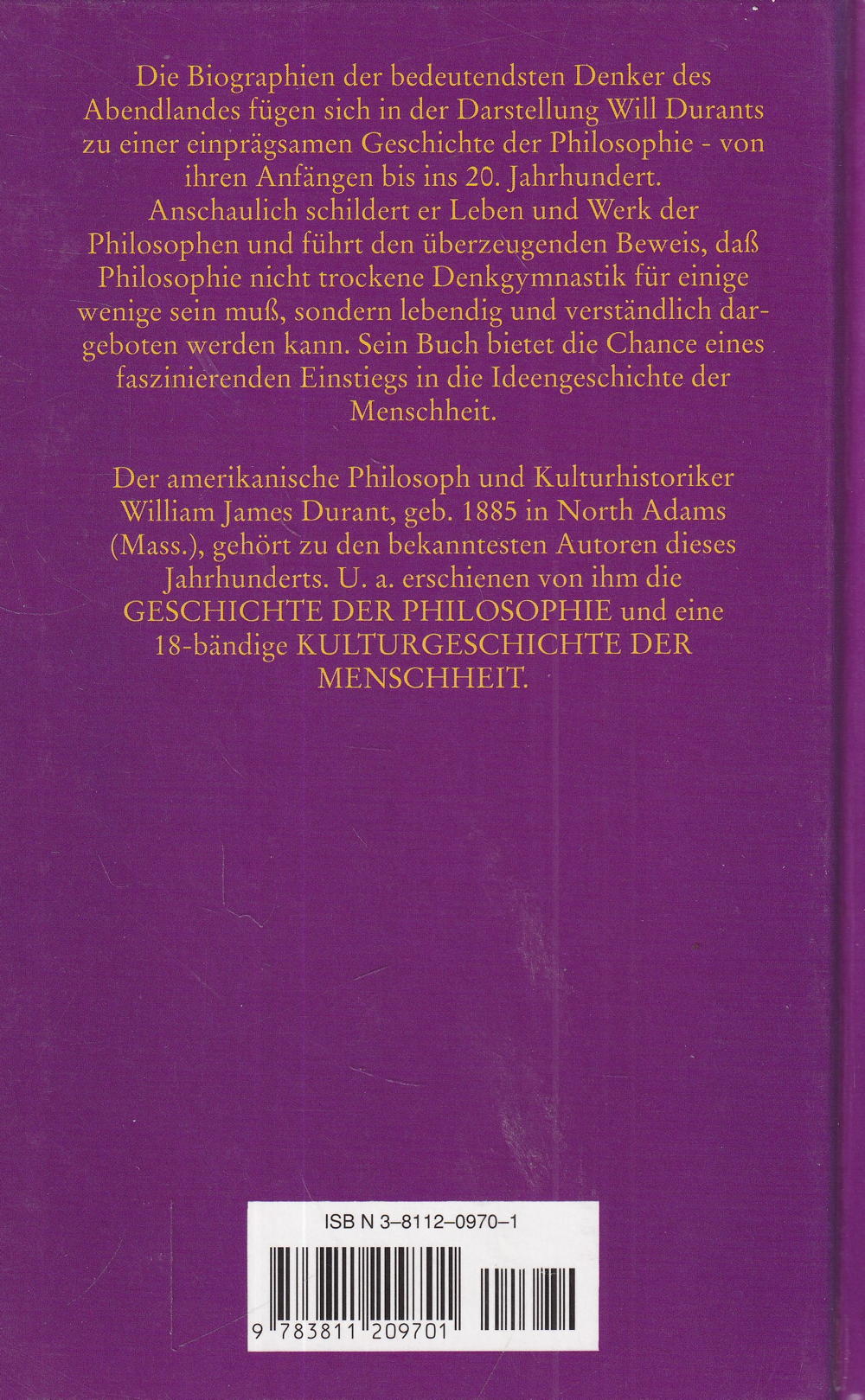 Die Biographien der bedeutendsten Denker des Abendlandes fügen sich in der Darstellung Will Durants zu einer einprägsamen Geschichte der Philosophie - von ihren Anfängen bis ins 20. Jahrhundert.