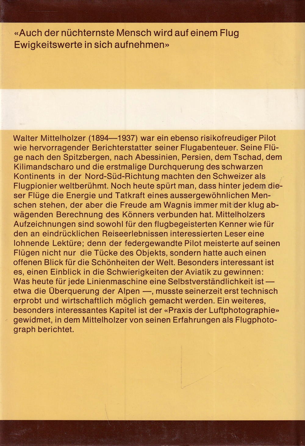 Walter Mittelholzer (1894-1937) war ein ebenso risikofreudiger Pilot wie hervorragender Berichterstatter seiner Flugabenteuer. Seine Flüge nach den Spitzbergen, nach Abessinien, Persien, dem Tschad, dem Kilimandscharo und die erstmalige Durchquerung des schwarzen Kontinents in der Nord-Süd-Richtung machten den Schweizer als Flugpionier weltberühmt. Noch heute spürt man, dass hinter jedem dieser Flüge die Energie und Tatkraft eines aussergewöhnlichen Menschen stehen, der aber die Freude am Wagnis immer mit der klug abwägenden Berechnung des Könners verbunden hat. Mittelholzers Aufzeichnungen sind sowohl für den flugbegeisterten Kenner wie für den an eindrücklichen Reiseerlebnissen interessierten Leser eine lohnende Lektüre; denn der federgewandte Pilot meisterte auf seinen Flügen nicht nur die Tücke des Objekts, sondern hatte auch einen offenen Blick für die Schönheiten der Welt. Besonders interessant ist es, einen Einblick in die Schwierigkeiten der Aviatik zu gewinnen.
