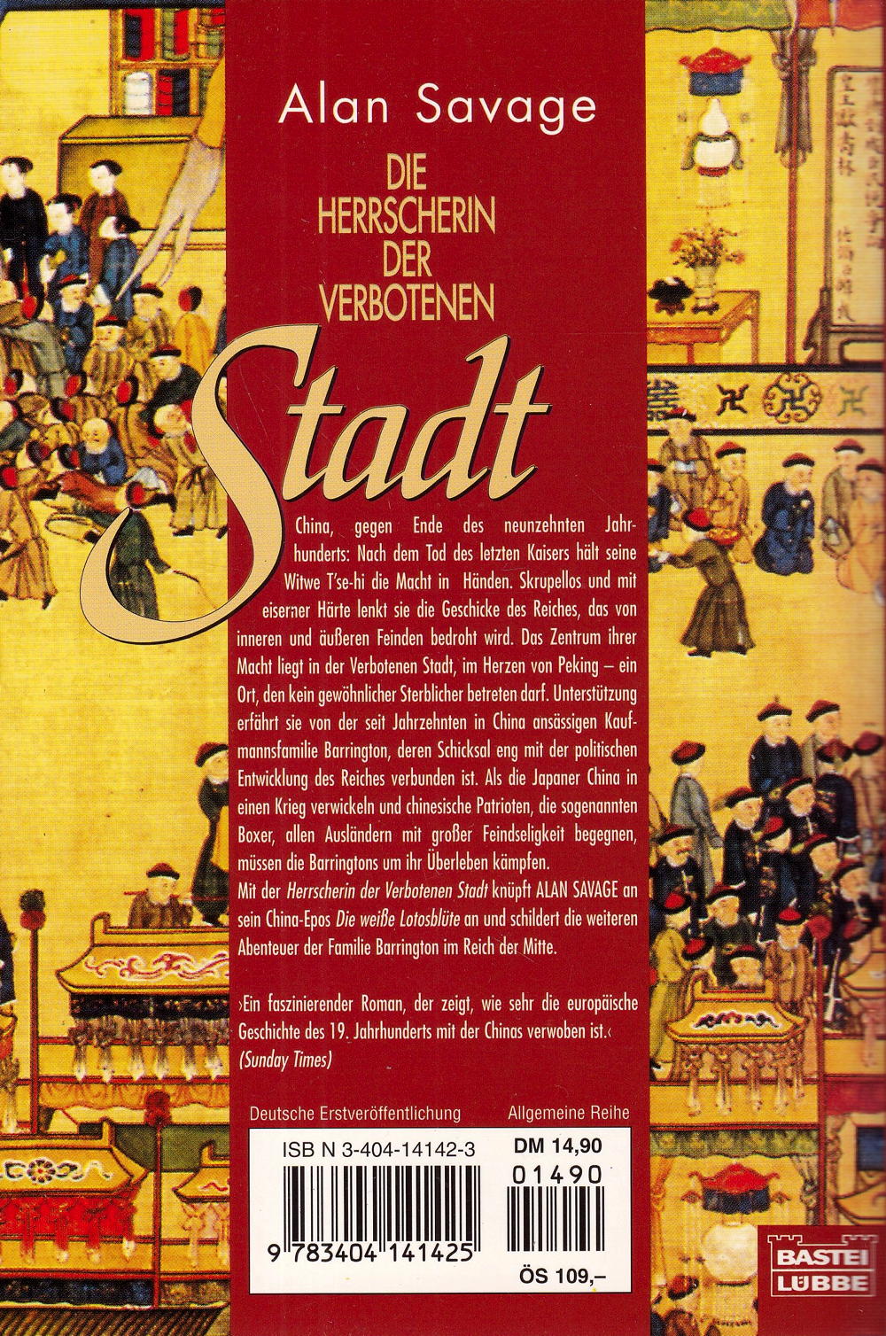 China, gegen Ende des neunzehnten Jahrhunderts: Nach dem Tod des letzten Kaisers hält seine Witwe T'se-hi die Macht in Händen. Skrupellos und mit eiserner Härte lenkt sie die Geschicke des Reiches, das von inneren und äusseren Feinden bedroht wird. Das Zentrum ihrer Macht liegt in der Verbotenen Stadt, im Herzen von Peking – ein Ort, den kein gewöhnlicher Sterblicher betreten darf. Unterstützung erfährt sie von der seit Jahrzehnten in China ansässigen Kaufmannsfamilie Barrington, deren Schicksal eng mit der politischen Entwicklung des Reiches verbunden ist. Als die Japaner China in einen Krieg verwickeln und chinesische Patrioten, die sogenannten Boxer, allen Ausländern mit grosser Feindseligkeit begegnen, müssen die Barringtons um ihr Überleben kämpfen. Mit der Herrscherin der Verbotenen Stadt knüpft ALAN SAVAGE an sein China-Epos Die weisse Lotosblüte an und schildert die weiteren Abenteuer der Familie Barrington im Reich der Mitte.