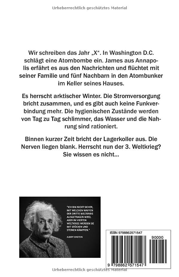 Inmitten einer Welt am Rande des atomaren Abgrunds entführt Sie dieses Buch in die tiefsten Abgründe menschlicher Ängste und Dramen. Washington D. C. steht in Flammen, verheert durch den Einschlag einer Atombombe. Nur 50 Kilometer entfernt flieht James in den schützenden Untergrund seines Hauses – in einen Bunker, der eigentlich nur für seine Familie vorgesehen war. Doch das Schicksal führt fünf weitere Seelen zu ihm, die verzweifelt um Schutz bitten. Bald wird klar: Dieser Bunker ist nicht auf zehn Menschen ausgelegt. In der drückenden Enge und bei sinkenden Ressourcen zerrt der Lagerkoller an den Nerven. Ein Batterieradio, das kein Signal mehr findet, lässt sie im Unklaren. Ist es nur eine Bombe oder der Beginn des Dritten Weltkriegs? Als die Verzweiflung wächst, kommen Drogen ins Spiel, und ein gefährliches Spiel um Macht, Vertrauen und Überleben beginnt. Die Suche nach Wärme führt sie in den oberen Teil des Hauses, wo die Strahlenbelastung und Krankheiten ihren Tribut fordern. Dieses Buch vereint sorgfältig recherchierte Fakten mit einer packenden fiktionalen Erzählung und konfrontiert den Leser mit der Frage: Wie weit würden Sie gehen, wenn die Welt um Sie herum in Chaos versinkt? Treten Sie ein in die dunkle Welt von James und seinen Nachbarn und erleben Sie eine Geschichte, die Sie nicht so schnell loslassen wird. Ein Muss für Fans von dystopischen Romanen und jene, die sich fragen, was in den finstersten Momenten der Menschheit wirklich zählt.