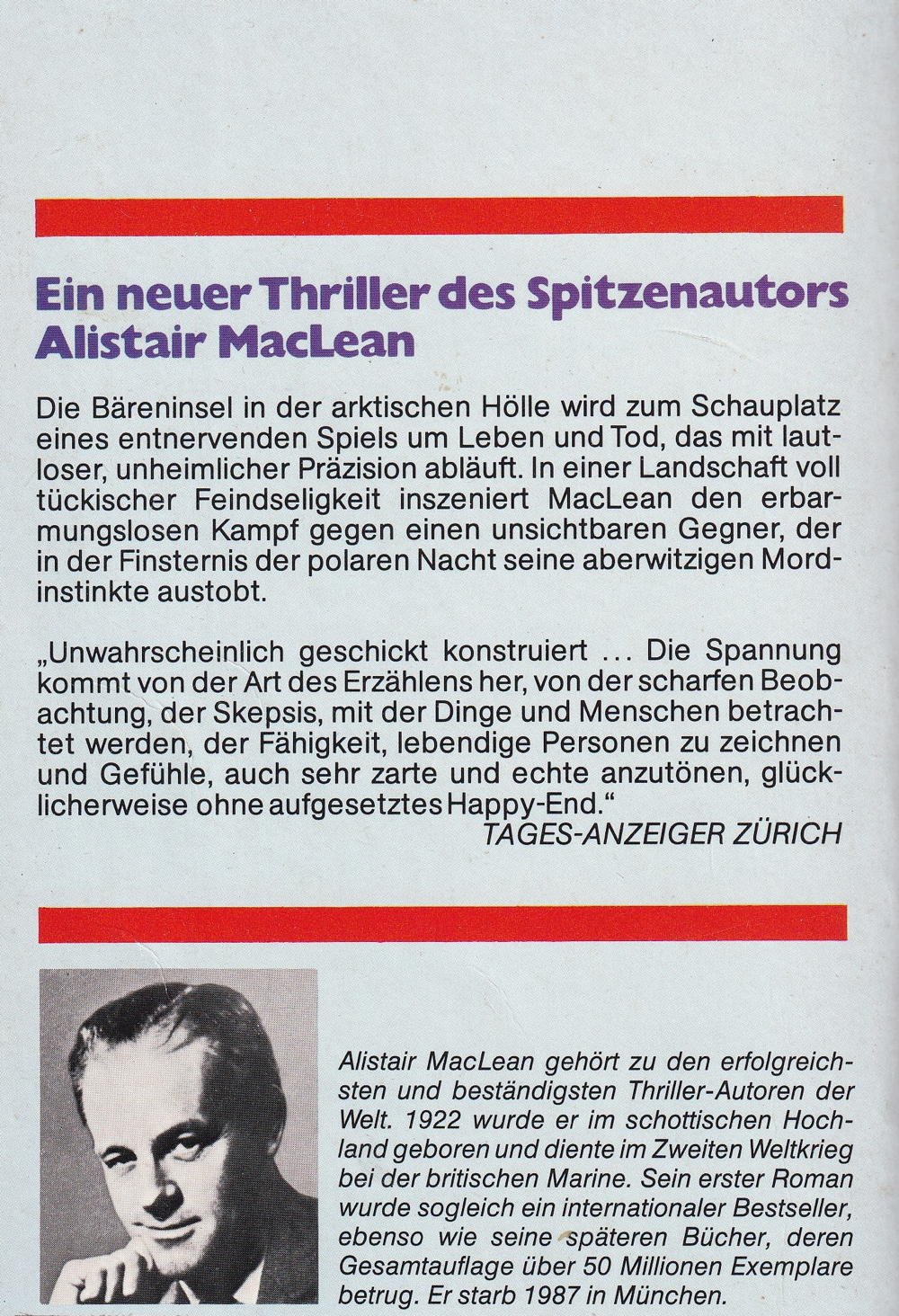 Die Bäreninsel in der arktischen Hölle wird zum Schauplatz eines entnervenden Spiels um Leben und Tod, das mit lautloser, unheimlicher Präzision abläuft. In einer Landschaft voll tückischer Feindseligkeit inszeniert MacLean den erbarmungslosen Kampf gegen einen unsichtbaren Gegner, der in der Finsternis der polaren Nacht seine aberwitzigen Mordinstinkte austobt.