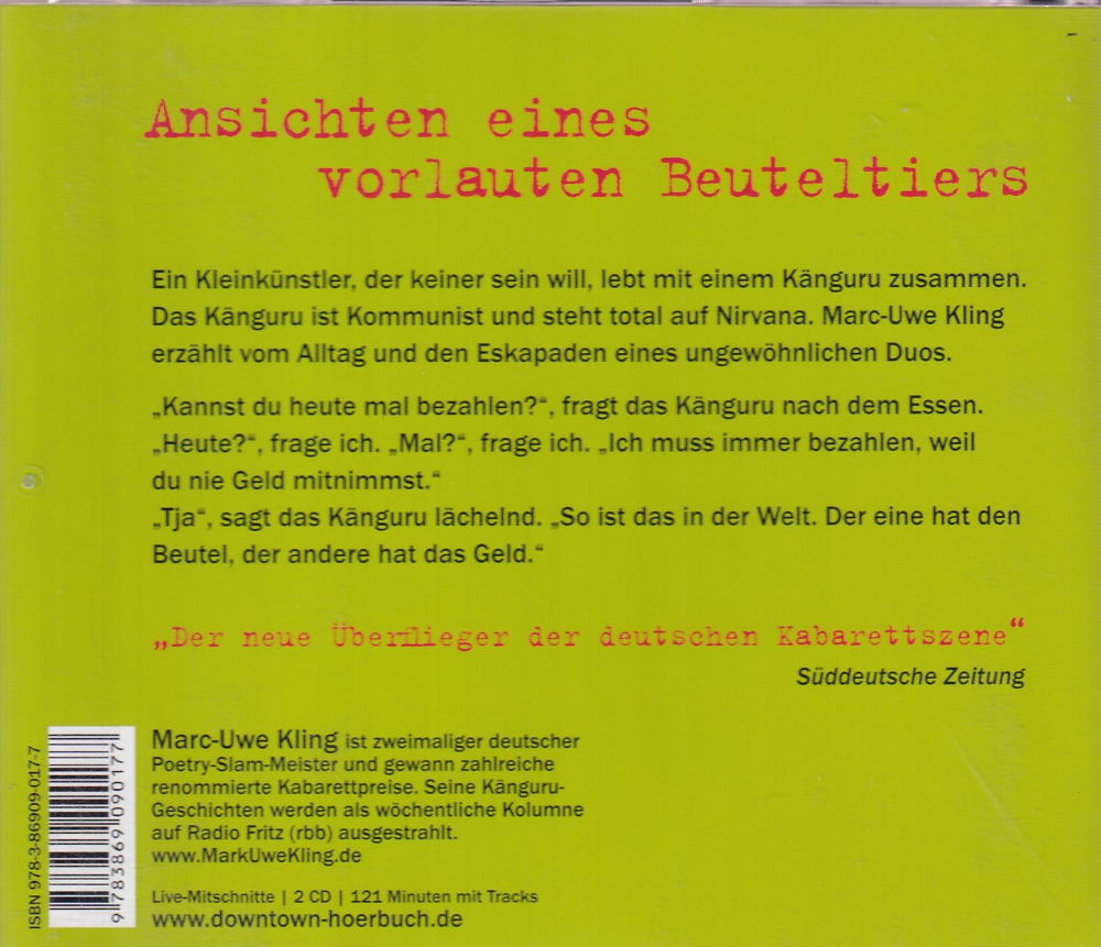 Ein Kleinkünstler, der keiner sein will, lebt mit einem Känguru zusammen. Das Känguru ist Kommunist und steht total auf Nirvana. Marc-Uwe Kling erzählt vom Alltag und den Eskapaden eines ungewöhnlichen Duos. „Kannst du heute mal bezahlen? ", fragt das Kānguru nach dem Essen. „Heute? ", frage ich. „Mal? ", frage ich. „Ich muss immer bezahlen, weil du nie Geld mitnimmst. " „Tja“,sagt das Kānguru lächelnd. „So ist das in der Welt. Der eine hat den Beutel, der andere hat das Geld. "