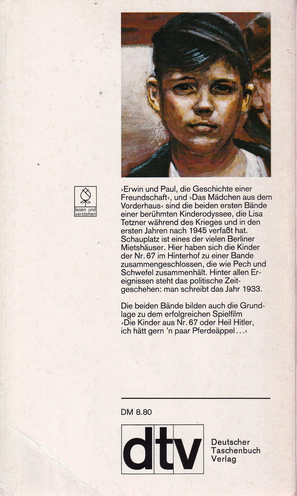 Lisa Tetzner 1894-1963, war Märchenerzählerin, Kinderfunkleiterin und Autorin von sozial engagierten Romanen, die Jugendliche bis heute fesseln. 1935 erschienen die Bücher "Erwin und Paul" und "Das Mädchen aus dem Vorderhaus": Sie eröffneten die Serie "Die Kinder aus Nr. 67", die Lisa Tetzner bis 1946 vollendete.