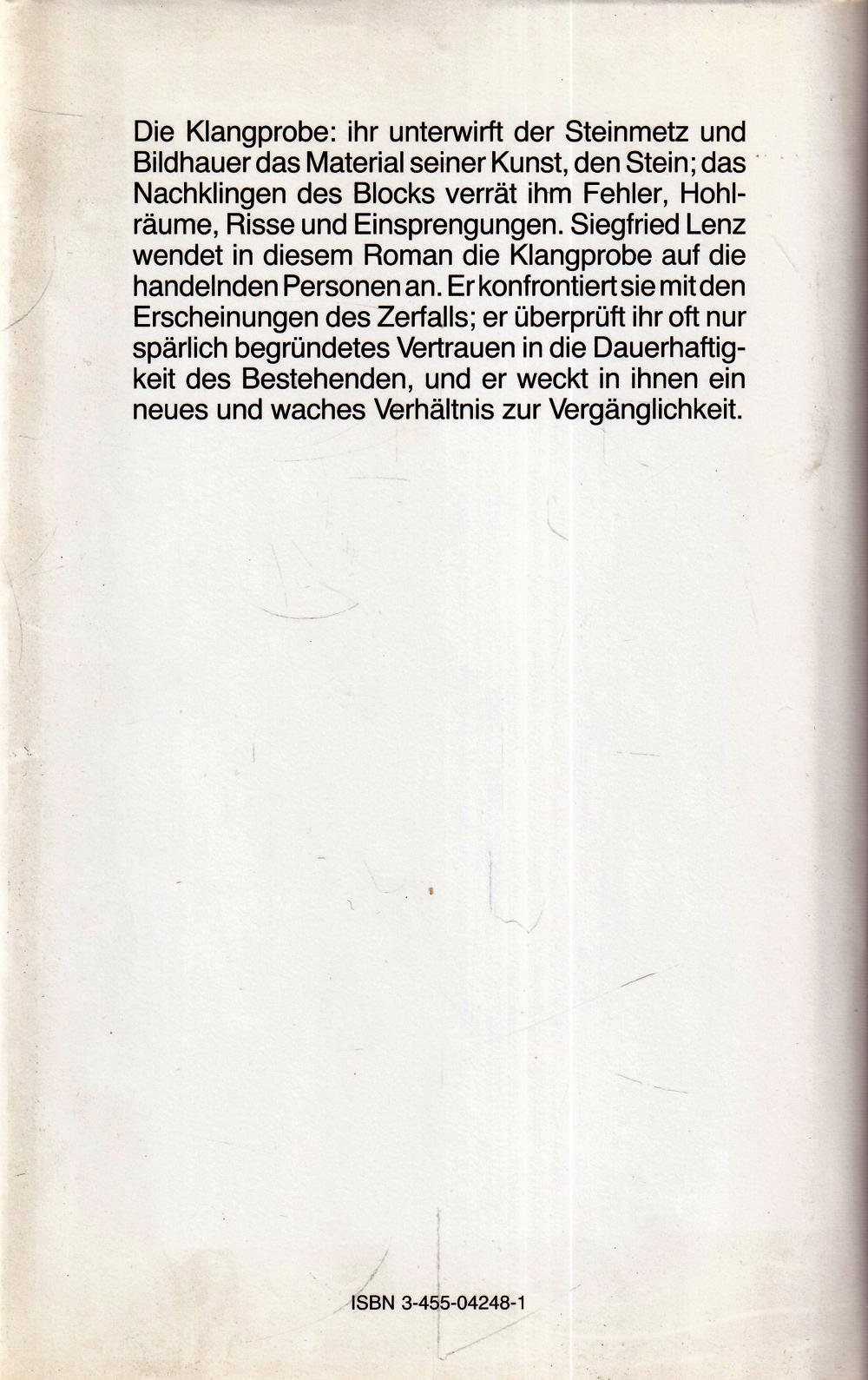 Die Klangprobe: ihr unterwirft der Steinmetz und Bildhauer das Material seiner Kunst, den Stein; das Nachklingen des Blocks verrät ihm Fehler, Hohlräume, Risse und Einsprengungen. Siegfried Lenz wendet in diesem Roman die Klangprobe auf die handelnden Personen an. Er konfrontiert sie mit den Erscheinungen des Zerfalls; er überprüft ihr oft nur spärlich begründetes Vertrauen in die Dauerhaftigkeit des Bestehenden, und er weckt in ihnen ein neues und waches Verhältnis zur Vergänglichkeit.