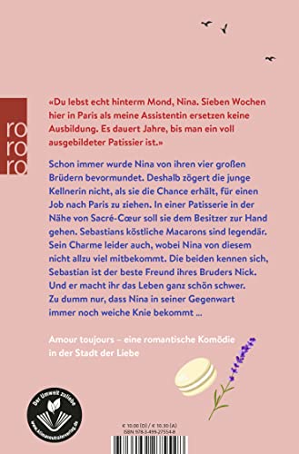 Schon immer wurde Nina von ihren vier grossen Brüdern bevormundet. Deshalb zögert die junge Kellnerin nicht, als sie die Chance erhält, für einen Job nach Paris zu ziehen. In einer Patisserie in der Nähe von Sacré-Cœur soll sie dem Besitzer zur Hand gehen. Sebastians köstliche Macarons sind legendär. Sein Charme leider auch, wobei Nina von diesem nicht allzu viel mitbekommt. Die beiden kennen sich, Sebastian ist der beste Freund ihres Bruders Nick. Und er macht ihr das Leben ganz schön schwer. Zu dumm nur, dass Nina in seiner Gegenwart immer noch weiche Knie bekommt …