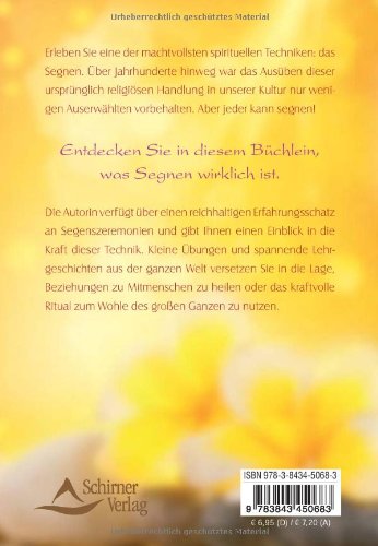 Segnen ist eine der machtvollsten spirituellen Techniken. Über viele Jahrhunderte hinweg glaubten die Menschen im Abendland, dass die Ausübung dieses mystisch anmutenden Rituals nur wenigen Auserwählten vorbehalten sei. Dieses Büchlein zeigt dem Leser nun, was Segnen ist und wie jeder segnen kann. Segnen ist praktische Realitätsgestaltung, Verwandlung und Konfliktlösung. Es ist die Verbindung mit der allgegenwärtigen göttlichen Energie, die sich Harmonie für uns und mit allem, was ist, wünscht. Der Leser erhält einen Einblick in die Kraft dieser Technik. Kleine Übungen und spannende Lehrgeschichten aus der ganzen Welt leiten ihn dazu an, private oder geschäftliche Beziehungen zu heilen oder das kraftvolle Ritual zum Wohle des grossen Ganzen zu nutzen.